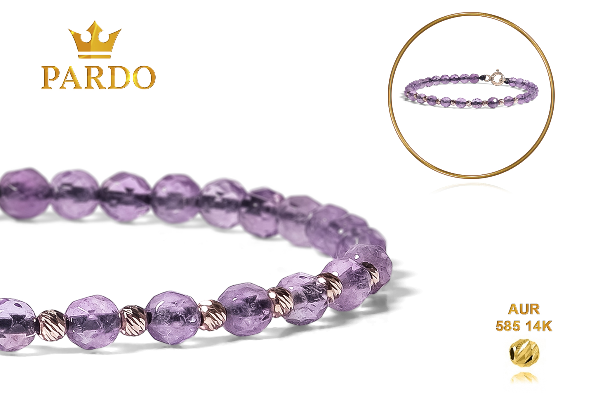 Întreaga colecție de brățări din aur este realizată cu aur de 14 Karate, aur de import Italia, calitatea aurului fiind astfel la un nivel superior. Aurul de 14 Karate folosit pentru colecțiile Pardo Gold este verificat certificat de organele abilitate prin autorizația emisă, astfel acesta corespunde în proportie de 94% din punct de vedere al caratajului cât și al gramajului.