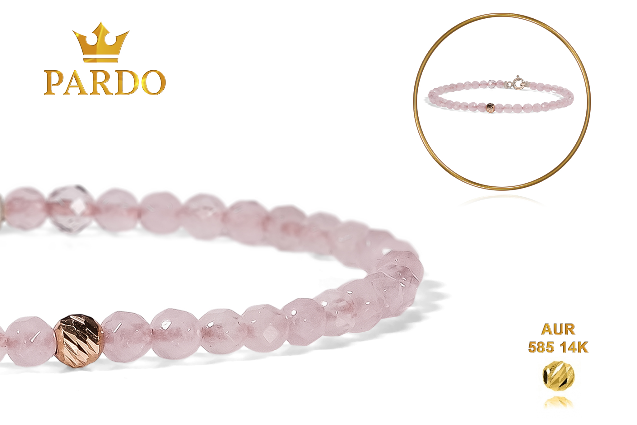 Întreaga colecție de brățări din aur este realizată cu aur de 14 Karate, aur de import Italia, calitatea aurului fiind astfel la un nivel superior. Aurul de 14 Karate folosit pentru colecțiile Pardo Gold este verificat certificat de organele abilitate prin autorizația emisă, astfel acesta corespunde în proportie de 94% din punct de vedere al caratajului cât și al gramajului.