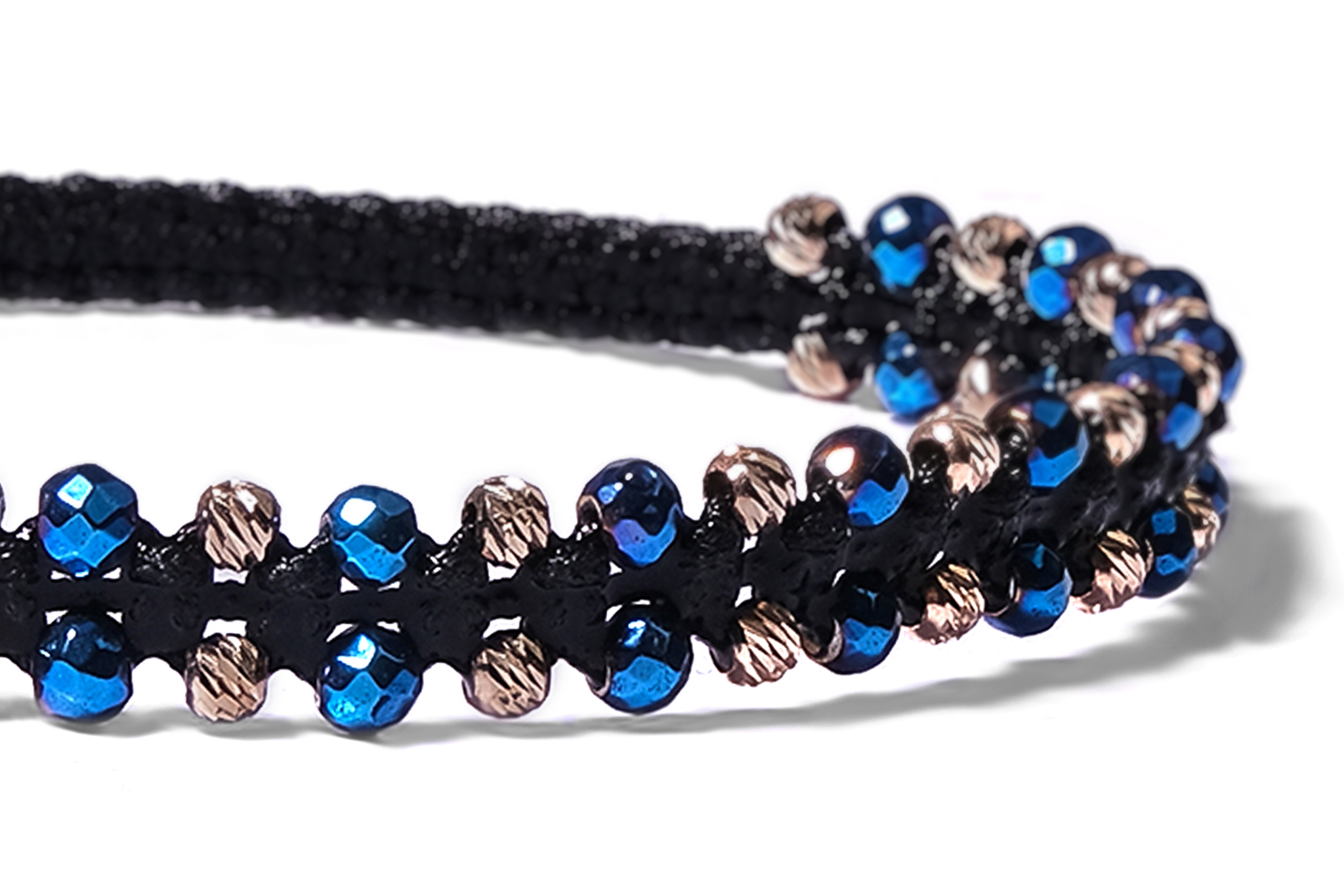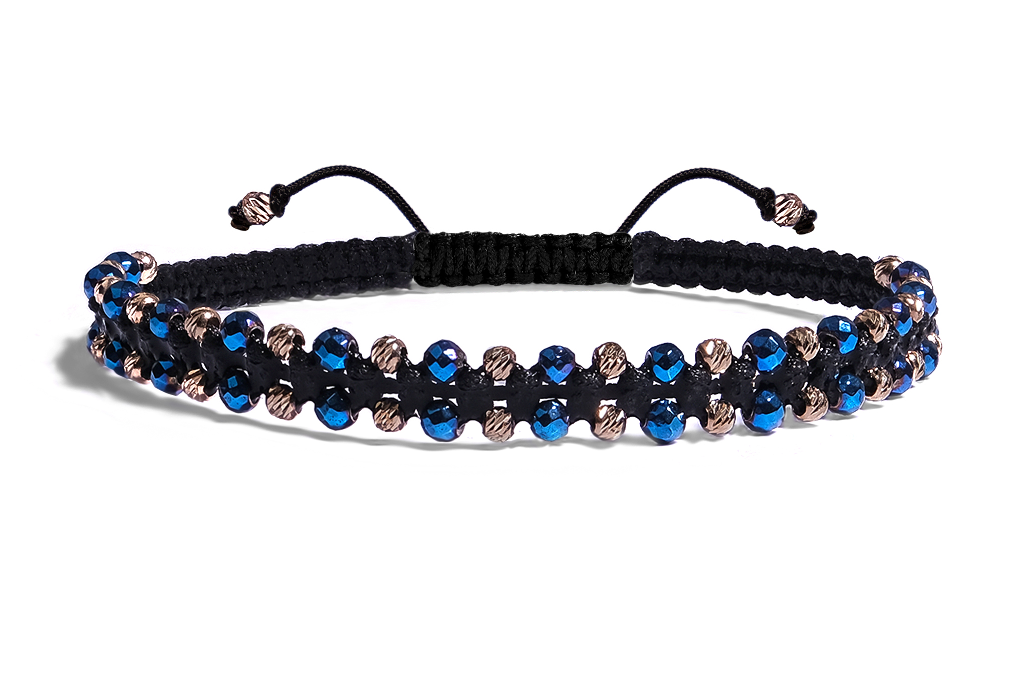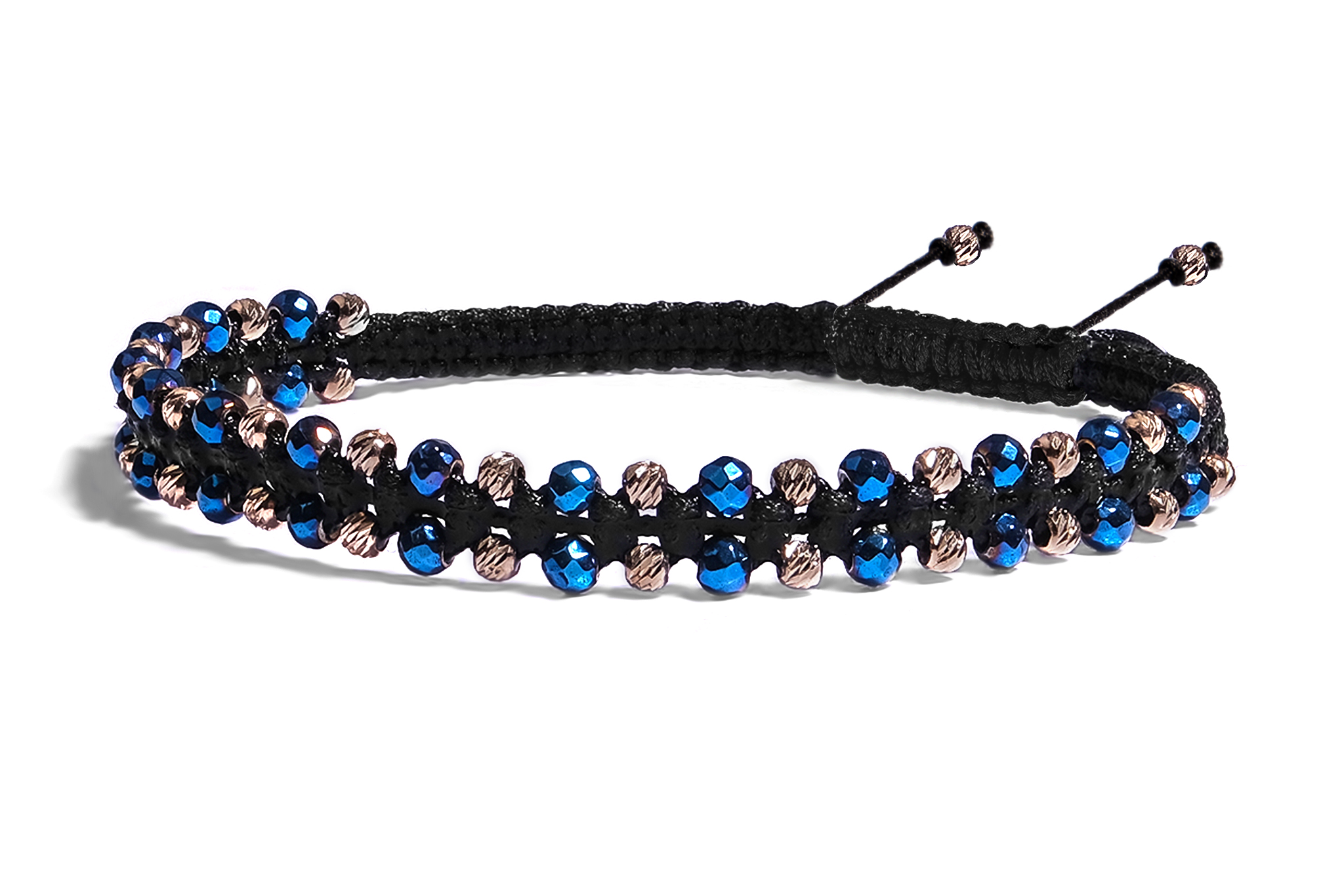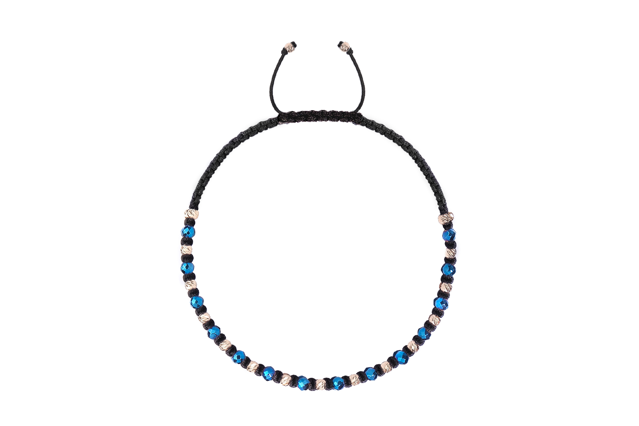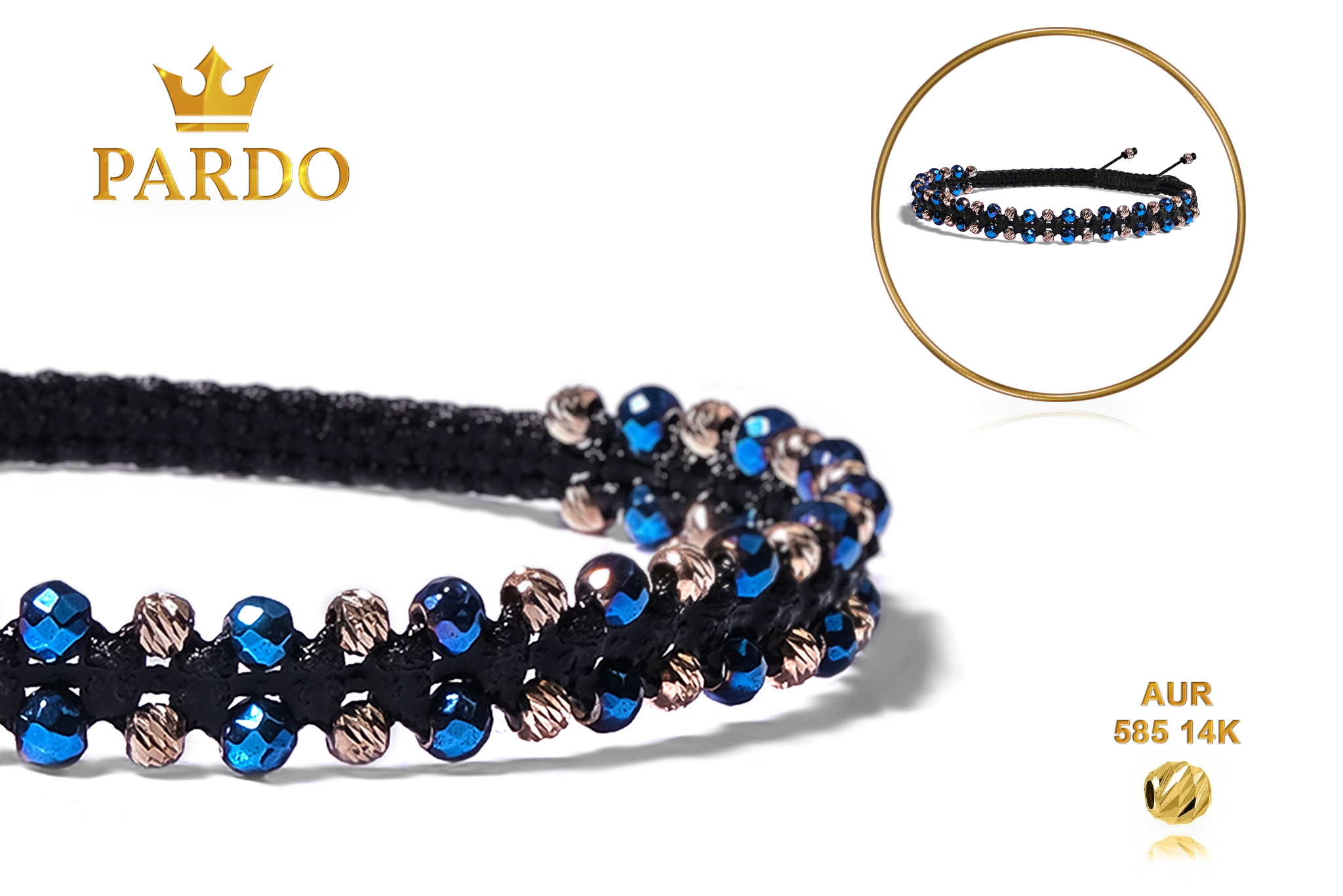 Bratara cu snur impletit Pardo realizata cu pietre semipretioase Hematit Albastru Fatetat de 3 mm si sfere striate din Aur 585 de 14 Karate