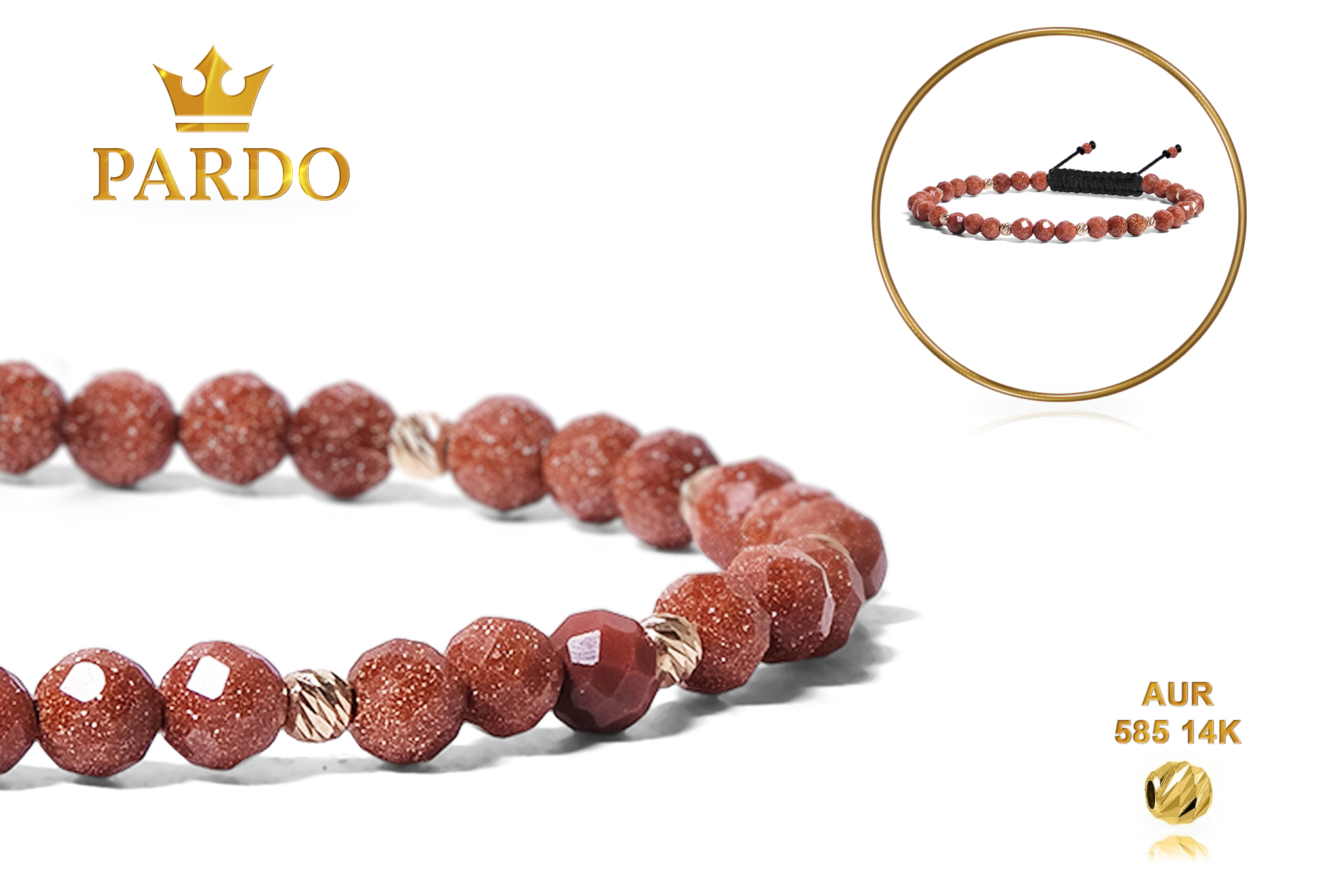 Întreaga colecție de brățări din aur este realizată cu aur de 14 Karate, aur de import Italia, calitatea aurului fiind astfel la un nivel superior. Aurul de 14 Karate folosit pentru colecțiile Pardo Gold este verificat certificat de organele abilitate prin autorizația emisă, astfel acesta corespunde în proportie de 94% din punct de vedere al caratajului cât și al gramajului.