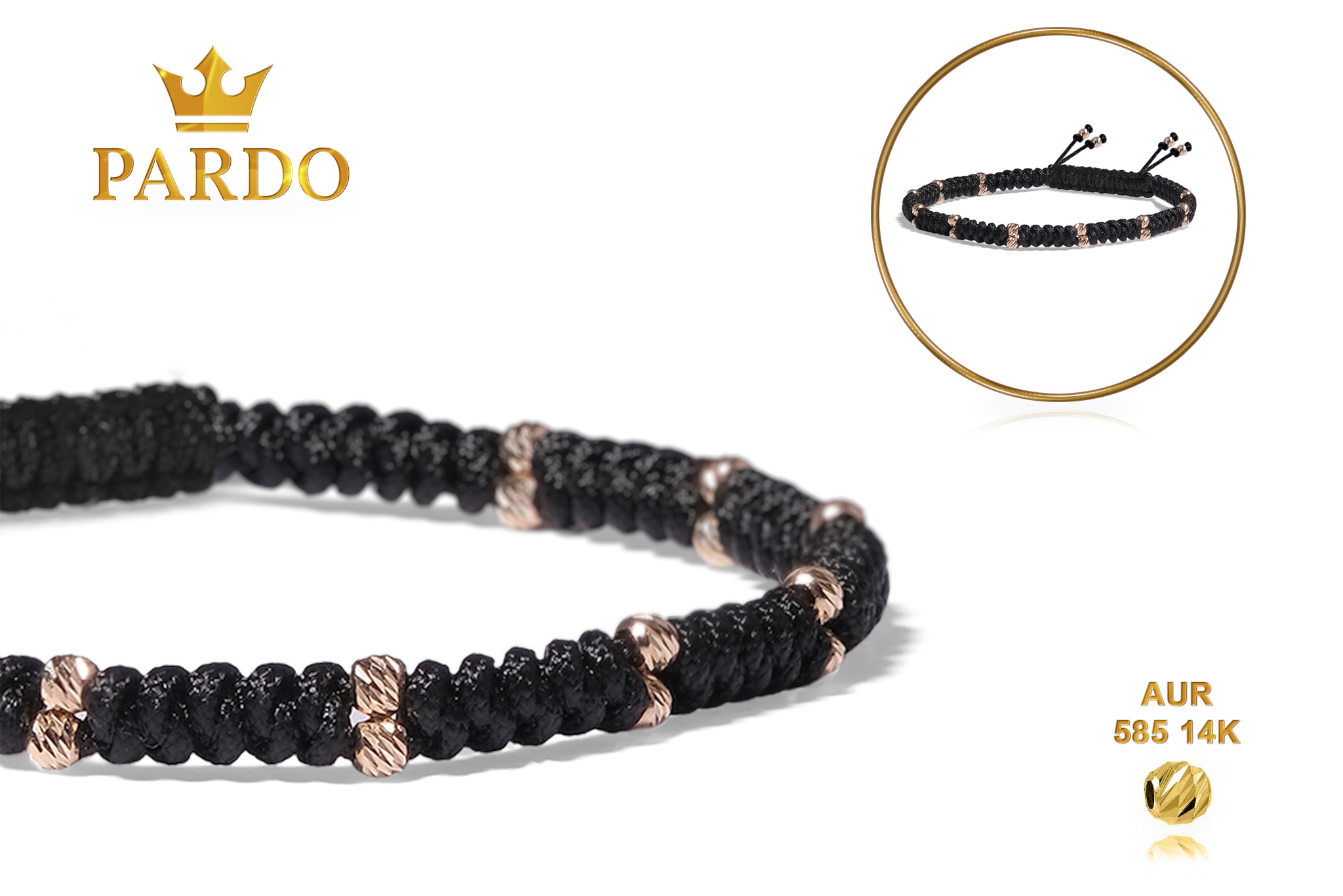 Întreaga colecție de brățări din aur este realizată cu aur de 14 Karate, aur de import Italia, calitatea aurului fiind astfel la un nivel superior. Aurul de 14 Karate folosit pentru colecțiile Pardo Gold este verificat certificat de organele abilitate prin autorizația emisă, astfel acesta corespunde în proportie de 94% din punct de vedere al caratajului cât și al gramajului.