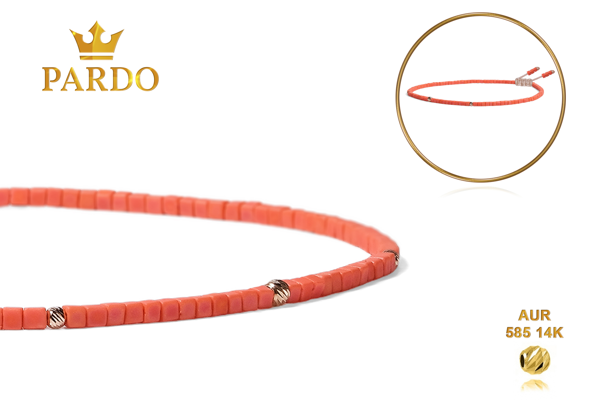 Întreaga colecție de brățări din aur este realizată cu aur de 14 Karate, aur de import Italia, calitatea aurului fiind astfel la un nivel superior. Aurul de 14 Karate folosit pentru colecțiile Pardo Gold este verificat certificat de organele abilitate prin autorizația emisă, astfel acesta corespunde în proportie de 94% din punct de vedere al caratajului cât și al gramajului.
