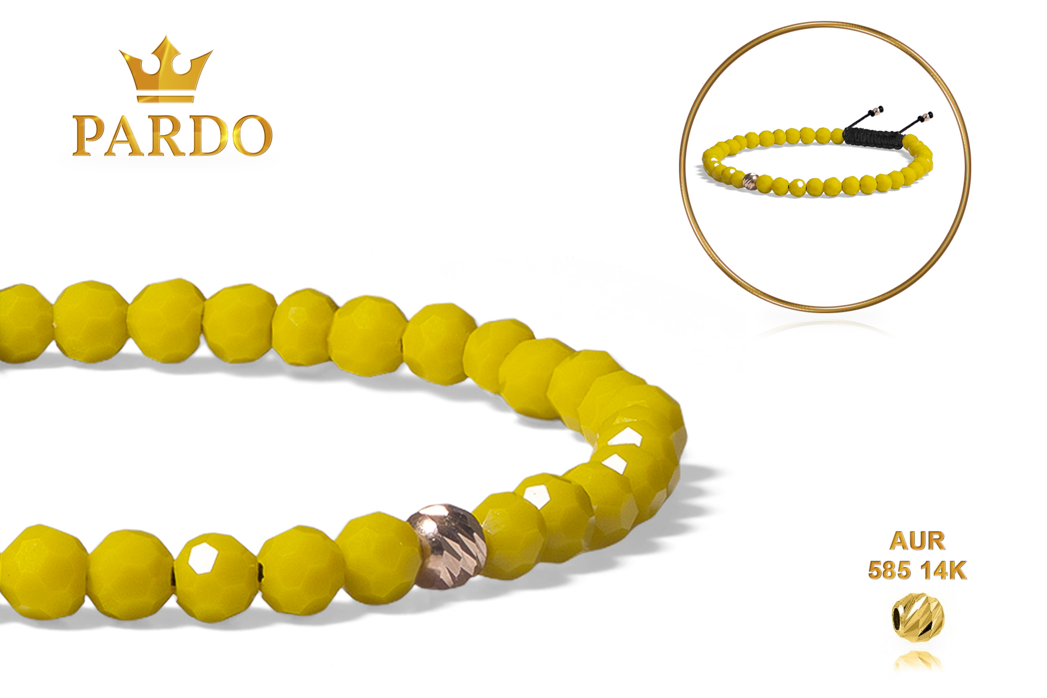 Întreaga colecție de brățări din aur este realizată cu aur de 14 Karate, aur de import Italia, calitatea aurului fiind astfel la un nivel superior. Aurul de 14 Karate folosit pentru colecțiile Pardo Gold este verificat certificat de organele abilitate prin autorizația emisă, astfel acesta corespunde în proportie de 94% din punct de vedere al caratajului cât și al gramajului.