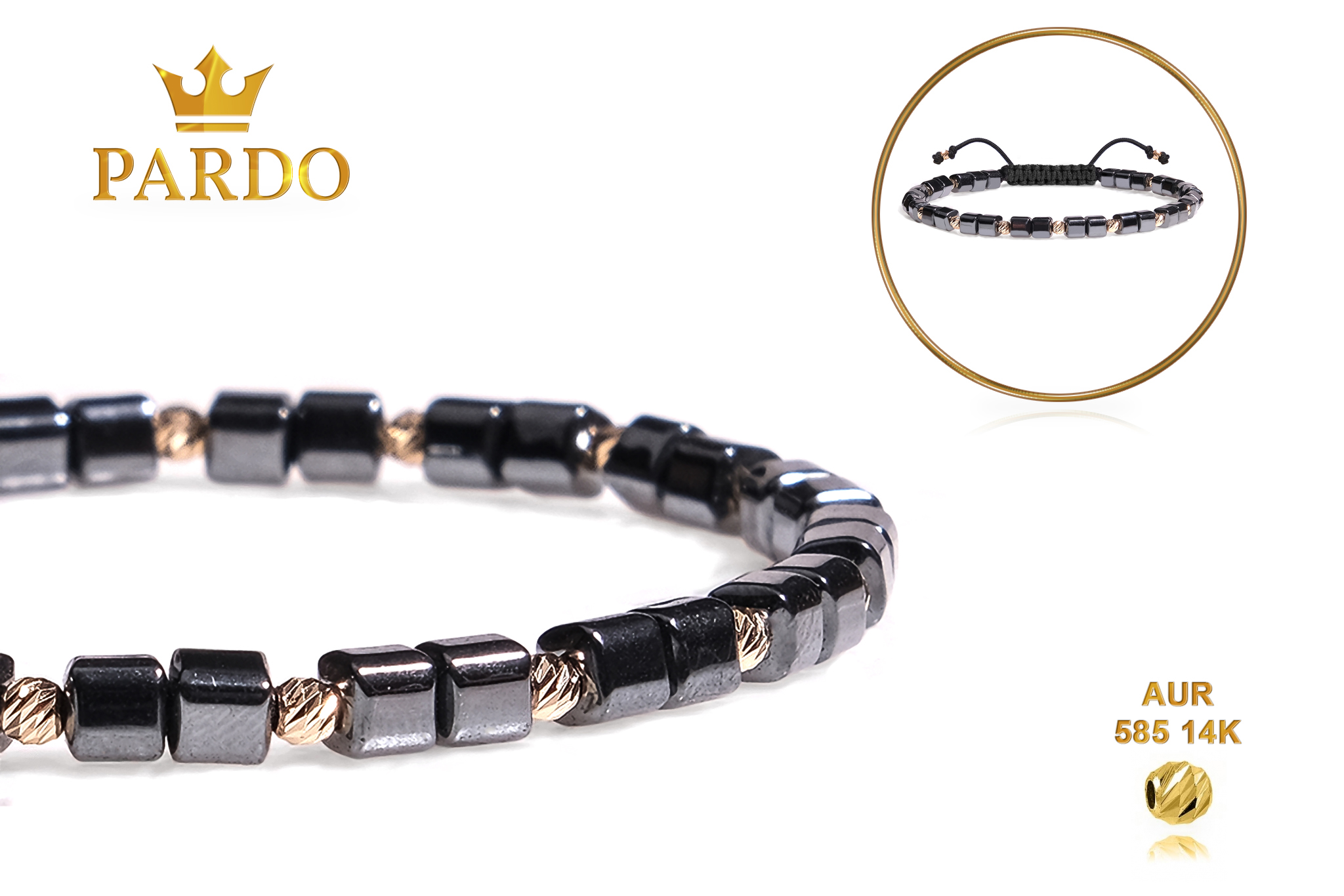 Întreaga colecție de brățări din aur este realizată cu aur de 14 Karate, aur de import Italia, calitatea aurului fiind astfel la un nivel superior. Aurul de 14 Karate folosit pentru colecțiile Pardo Gold este verificat certificat de organele abilitate prin autorizația emisă, astfel acesta corespunde în proportie de 94% din punct de vedere al caratajului cât și al gramajului.