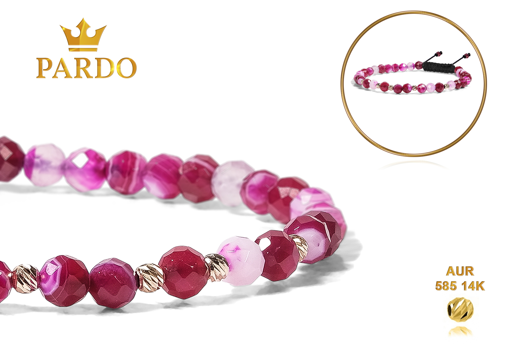 Întreaga colecție de brățări din aur este realizată cu aur de 14 Karate, aur de import Italia, calitatea aurului fiind astfel la un nivel superior. Aurul de 14 Karate folosit pentru colecțiile Pardo Gold este verificat certificat de organele abilitate prin autorizația emisă, astfel acesta corespunde în proportie de 94% din punct de vedere al caratajului cât și al gramajului.