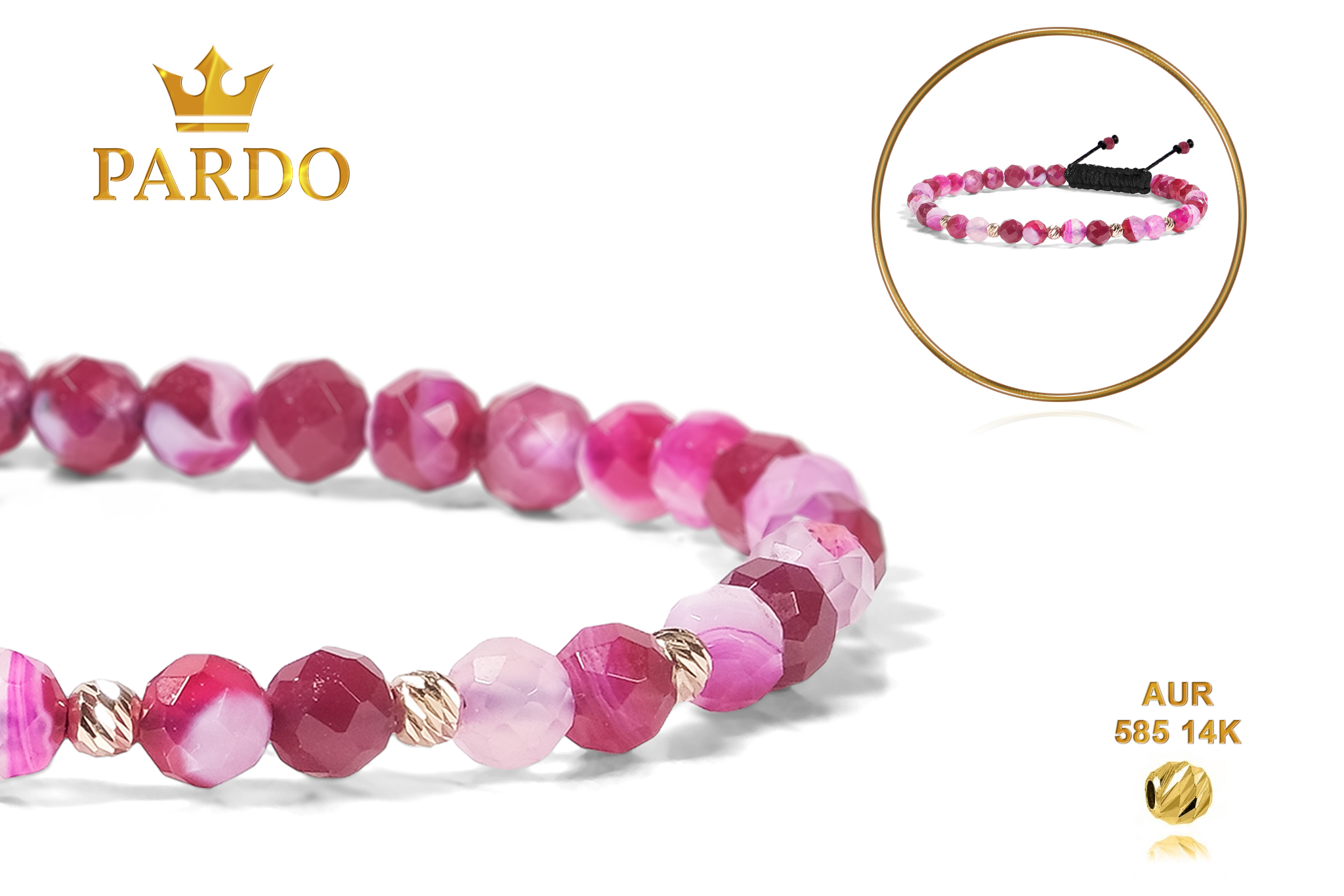 Întreaga colecție de brățări din aur este realizată cu aur de 14 Karate, aur de import Italia, calitatea aurului fiind astfel la un nivel superior. Aurul de 14 Karate folosit pentru colecțiile Pardo Gold este verificat certificat de organele abilitate prin autorizația emisă, astfel acesta corespunde în proportie de 94% din punct de vedere al caratajului cât și al gramajului.