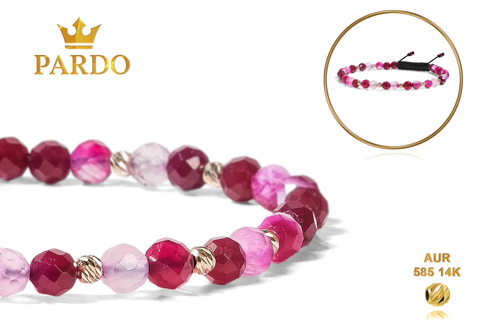 Întreaga colecție de brățări din aur este realizată cu aur de 14 Karate, aur de import Italia, calitatea aurului fiind astfel la un nivel superior. Aurul de 14 Karate folosit pentru colecțiile Pardo Gold este verificat certificat de organele abilitate prin autorizația emisă, astfel acesta corespunde în proportie de 94% din punct de vedere al caratajului cât și al gramajului.