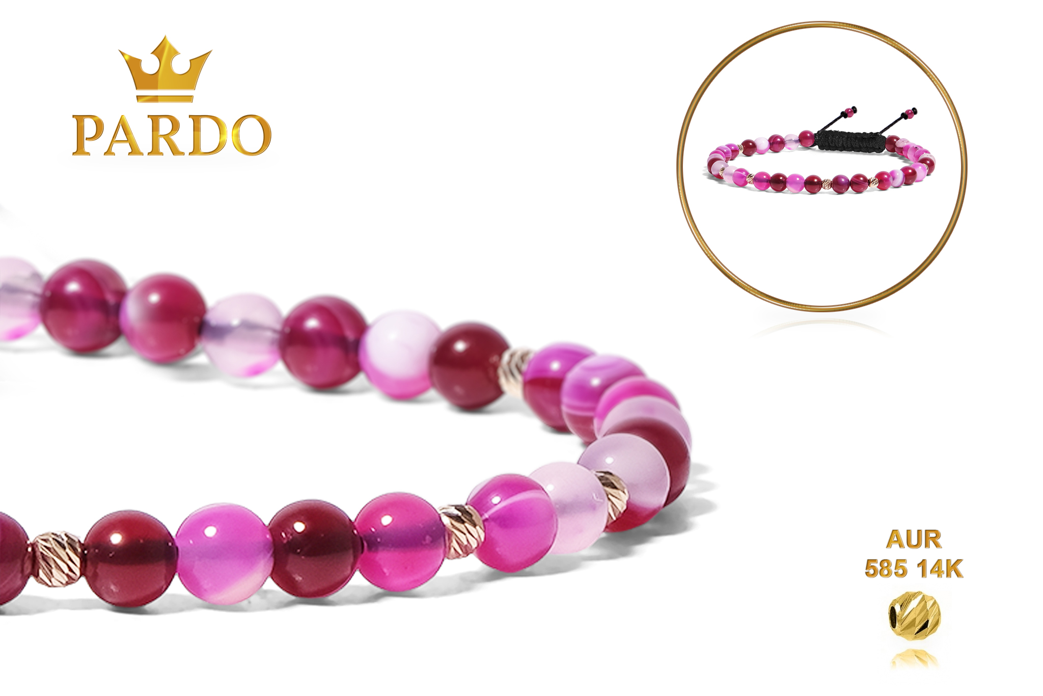 Întreaga colecție de brățări din aur este realizată cu aur de 14 Karate, aur de import Italia, calitatea aurului fiind astfel la un nivel superior. Aurul de 14 Karate folosit pentru colecțiile Pardo Gold este verificat certificat de organele abilitate prin autorizația emisă, astfel acesta corespunde în proportie de 94% din punct de vedere al caratajului cât și al gramajului.