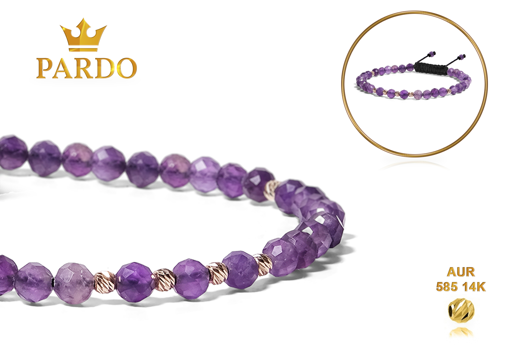 Întreaga colecție de brățări din aur este realizată cu aur de 14 Karate, aur de import Italia, calitatea aurului fiind astfel la un nivel superior. Aurul de 14 Karate folosit pentru colecțiile Pardo Gold este verificat certificat de organele abilitate prin autorizația emisă, astfel acesta corespunde în proportie de 94% din punct de vedere al caratajului cât și al gramajului.