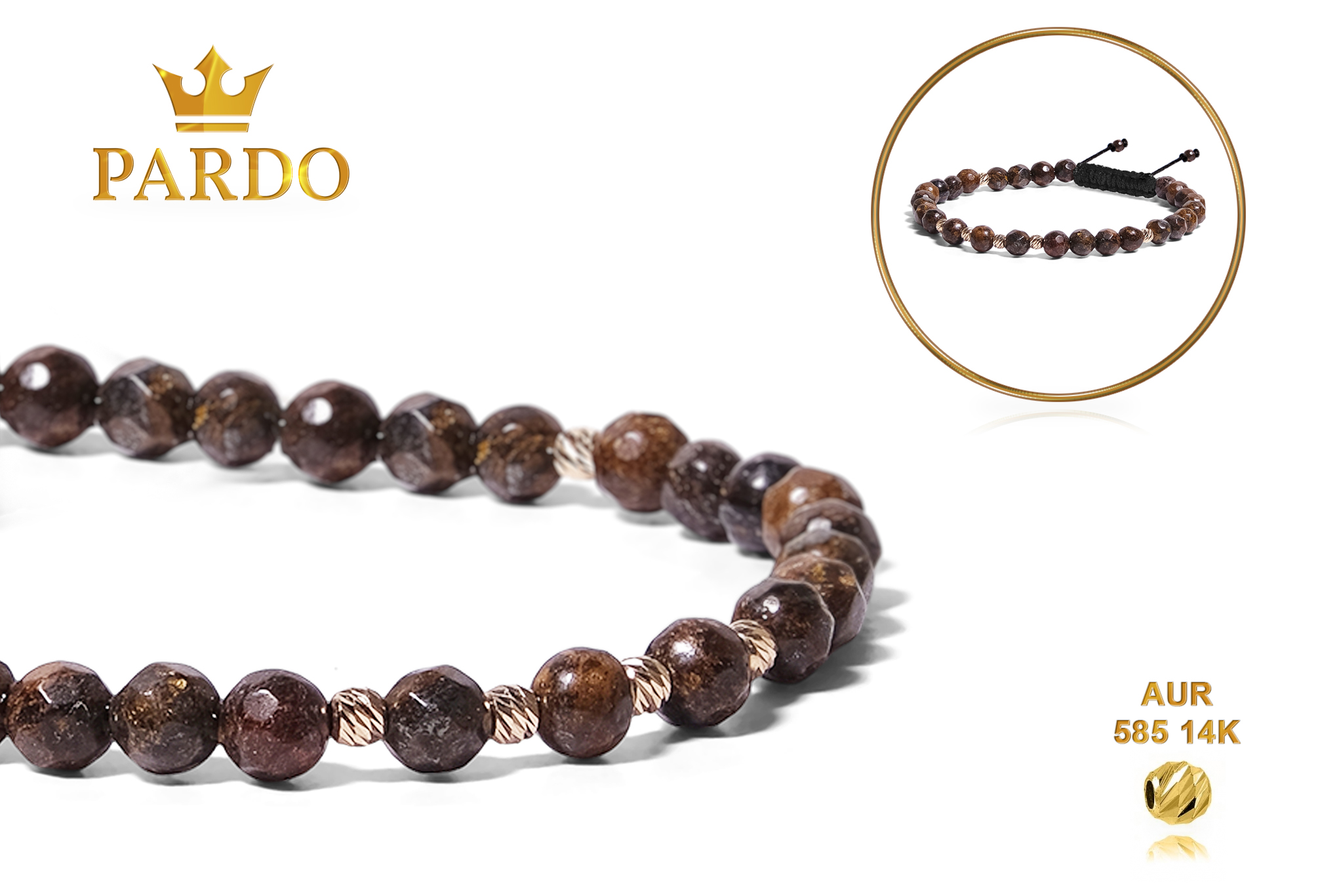 Întreaga colecție de brățări din aur este realizată cu aur de 14 Karate, aur de import Italia, calitatea aurului fiind astfel la un nivel superior. Aurul de 14 Karate folosit pentru colecțiile Pardo Gold este verificat certificat de organele abilitate prin autorizația emisă, astfel acesta corespunde în proportie de 94% din punct de vedere al caratajului cât și al gramajului.
