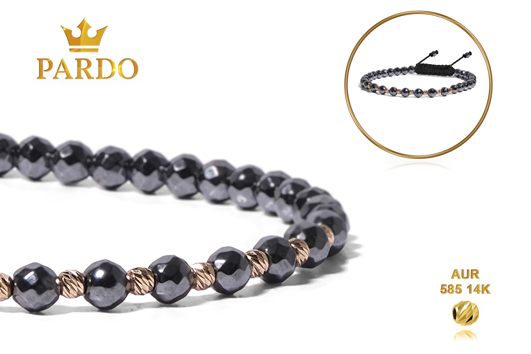 Întreaga colecție de brățări din aur este realizată cu aur de 14 Karate, aur de import Italia, calitatea aurului fiind astfel la un nivel superior. Aurul de 14 Karate folosit pentru colecțiile Pardo Gold este verificat certificat de organele abilitate prin autorizația emisă, astfel acesta corespunde în proportie de 94% din punct de vedere al caratajului cât și al gramajului.