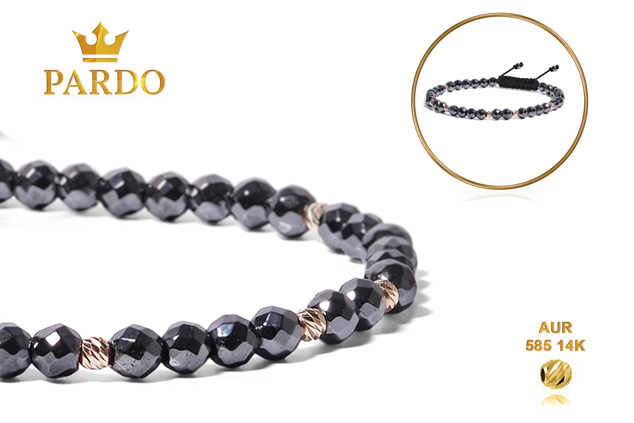Întreaga colecție de brățări din aur este realizată cu aur de 14 Karate, aur de import Italia, calitatea aurului fiind astfel la un nivel superior. Aurul de 14 Karate folosit pentru colecțiile Pardo Gold este verificat certificat de organele abilitate prin autorizația emisă, astfel acesta corespunde în proportie de 94% din punct de vedere al caratajului cât și al gramajului.