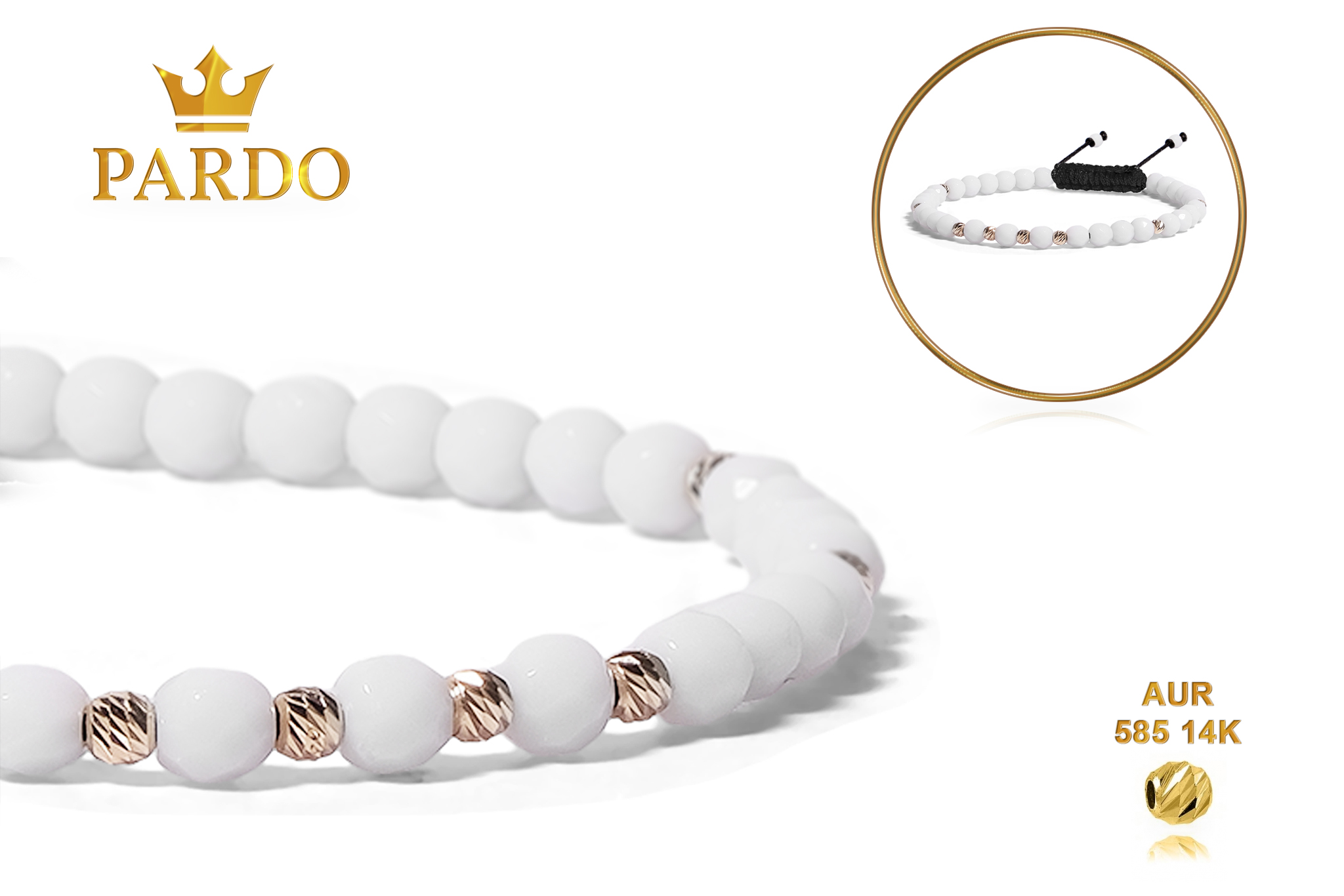 Întreaga colecție de brățări din aur este realizată cu aur de 14 Karate, aur de import Italia, calitatea aurului fiind astfel la un nivel superior. Aurul de 14 Karate folosit pentru colecțiile Pardo Gold este verificat certificat de organele abilitate prin autorizația emisă, astfel acesta corespunde în proportie de 94% din punct de vedere al caratajului cât și al gramajului.