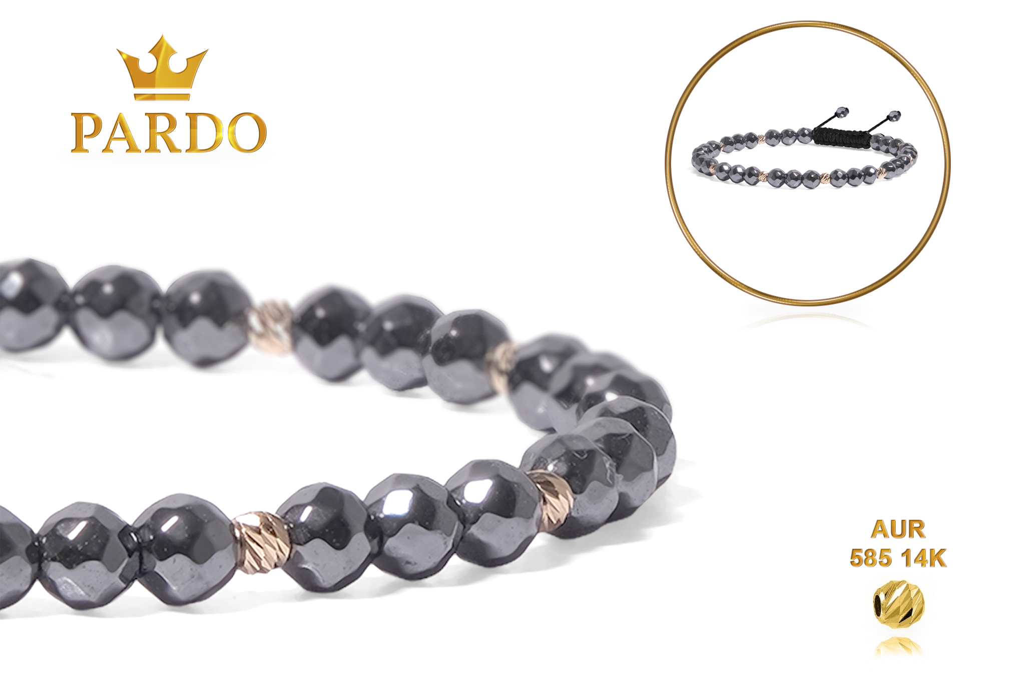 Întreaga colecție de brățări din aur este realizată cu aur de 14 Karate, aur de import Italia, calitatea aurului fiind astfel la un nivel superior. Aurul de 14 Karate folosit pentru colecțiile Pardo Gold este verificat certificat de organele abilitate prin autorizația emisă, astfel acesta corespunde în proportie de 94% din punct de vedere al caratajului cât și al gramajului.