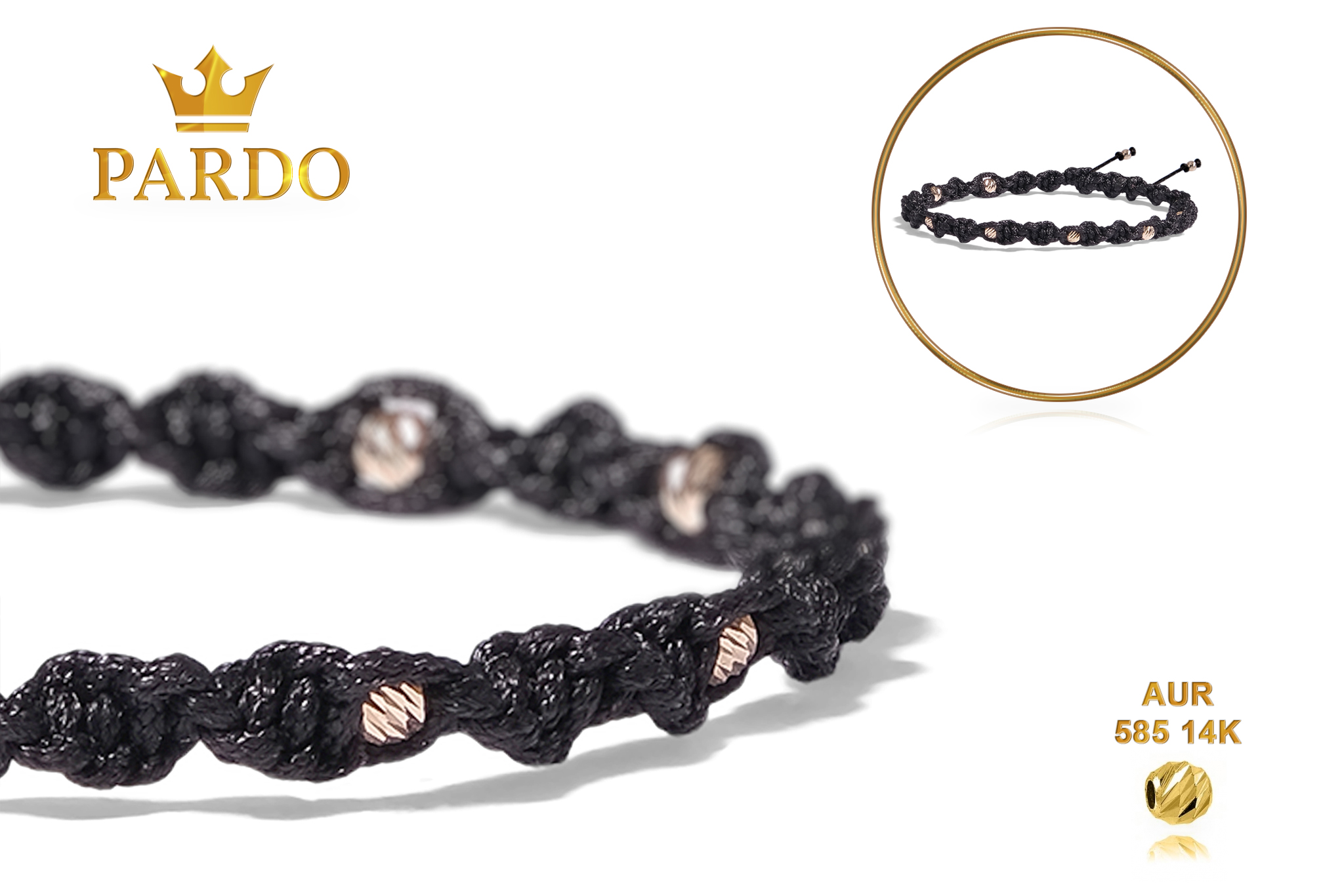Întreaga colecție de brățări din aur este realizată cu aur de 14 Karate, aur de import Italia, calitatea aurului fiind astfel la un nivel superior. Aurul de 14 Karate folosit pentru colecțiile Pardo Gold este verificat certificat de organele abilitate prin autorizația emisă, astfel acesta corespunde în proportie de 94% din punct de vedere al caratajului cât și al gramajului.