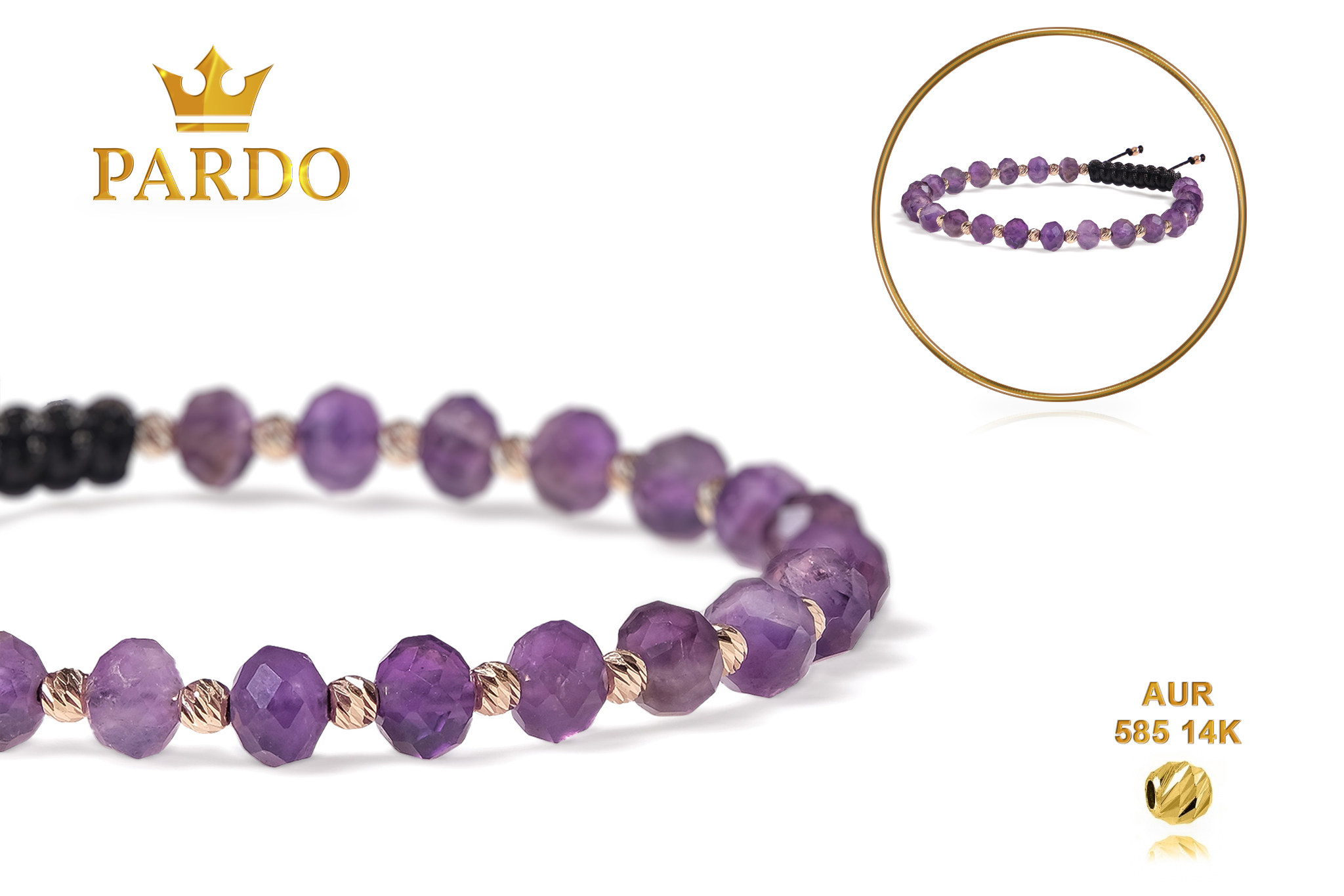 Întreaga colecție de brățări din aur este realizată cu aur de 14 Karate, aur de import Italia, calitatea aurului fiind astfel la un nivel superior. Aurul de 14 Karate folosit pentru colecțiile Pardo Gold este verificat certificat de organele abilitate prin autorizația emisă, astfel acesta corespunde în proportie de 94% din punct de vedere al caratajului cât și al gramajului.