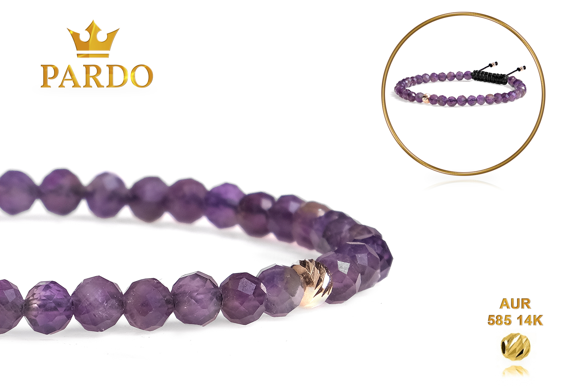 Întreaga colecție de brățări din aur este realizată cu aur de 14 Karate, aur de import Italia, calitatea aurului fiind astfel la un nivel superior. Aurul de 14 Karate folosit pentru colecțiile Pardo Gold este verificat certificat de organele abilitate prin autorizația emisă, astfel acesta corespunde în proportie de 94% din punct de vedere al caratajului cât și al gramajului.