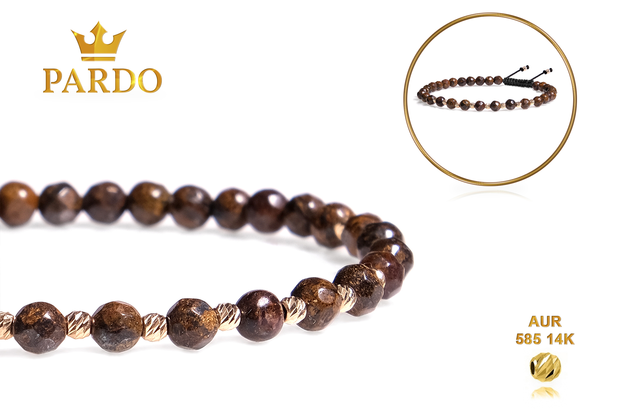 Întreaga colecție de brățări din aur este realizată cu aur de 14 Karate, aur de import Italia, calitatea aurului fiind astfel la un nivel superior. Aurul de 14 Karate folosit pentru colecțiile Pardo Gold este verificat certificat de organele abilitate prin autorizația emisă, astfel acesta corespunde în proportie de 94% din punct de vedere al caratajului cât și al gramajului.