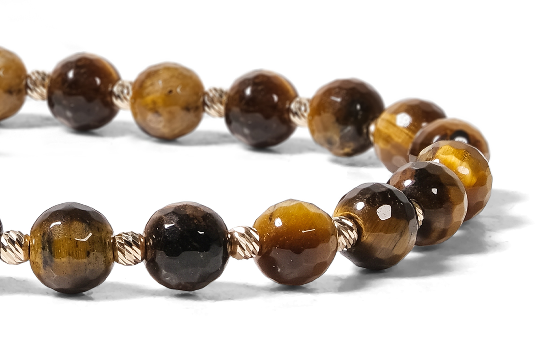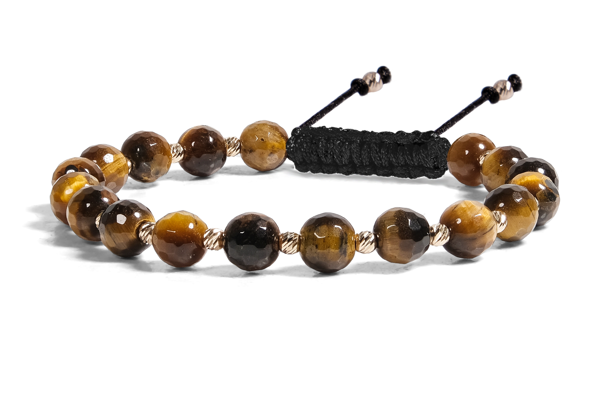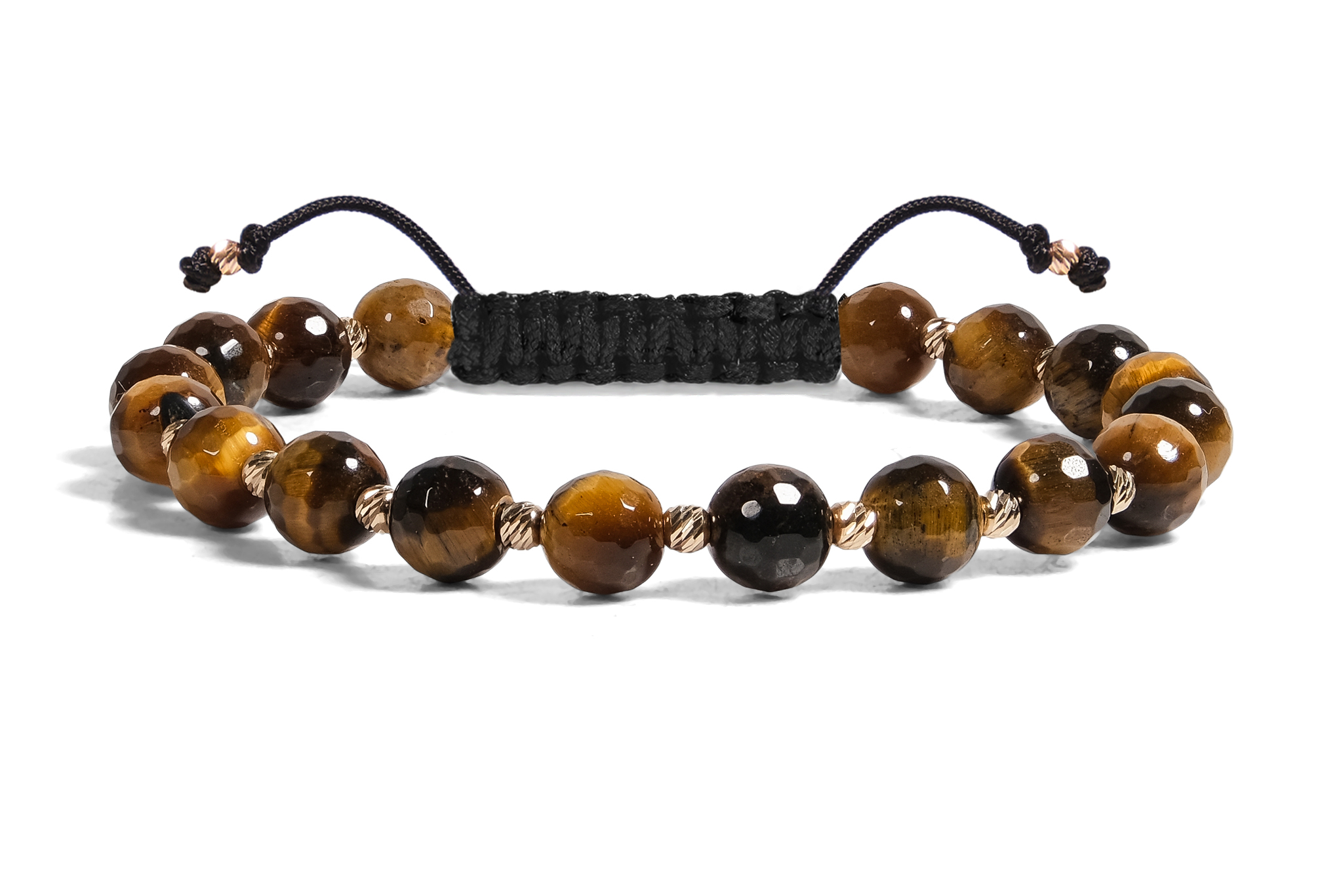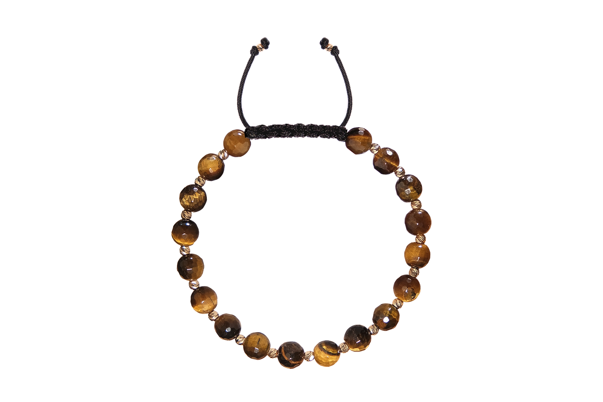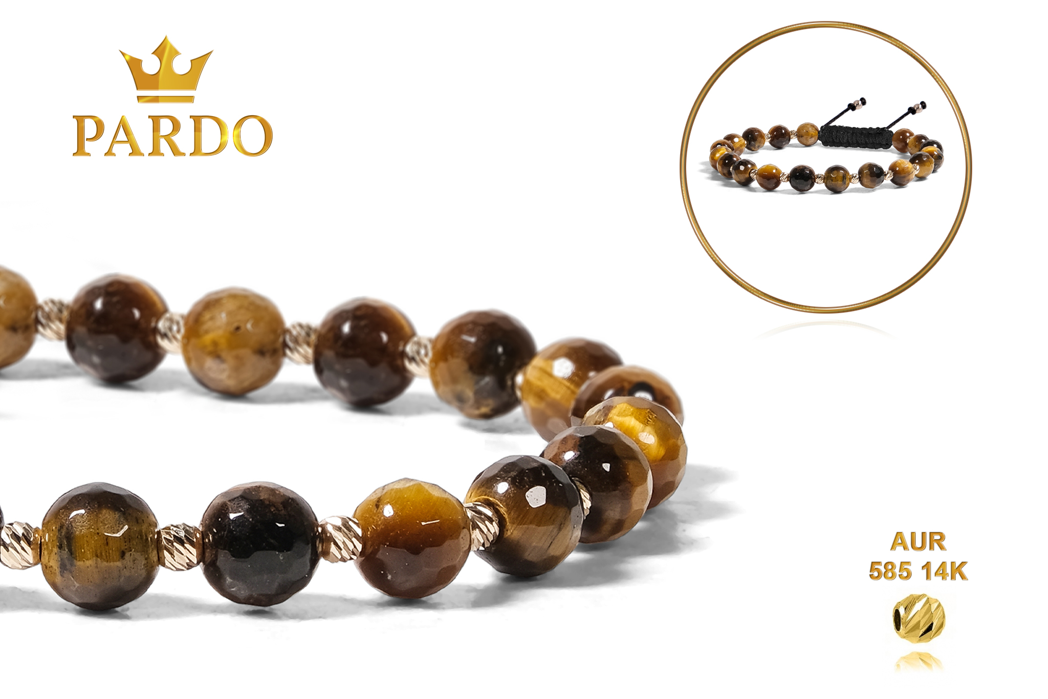 Brățară Pardo realizată cu șnur și bile de Aur 585 14K și Ochi de Tigru Maro Fațetat