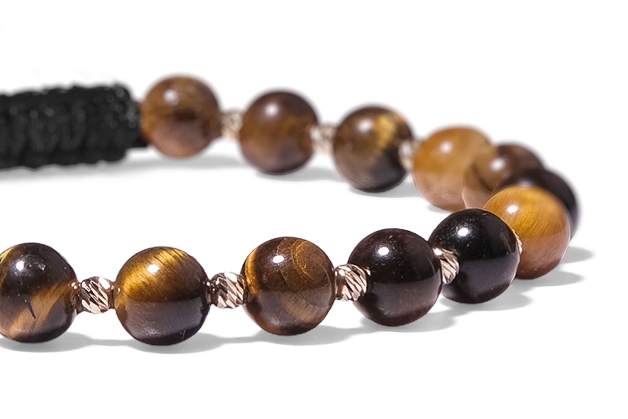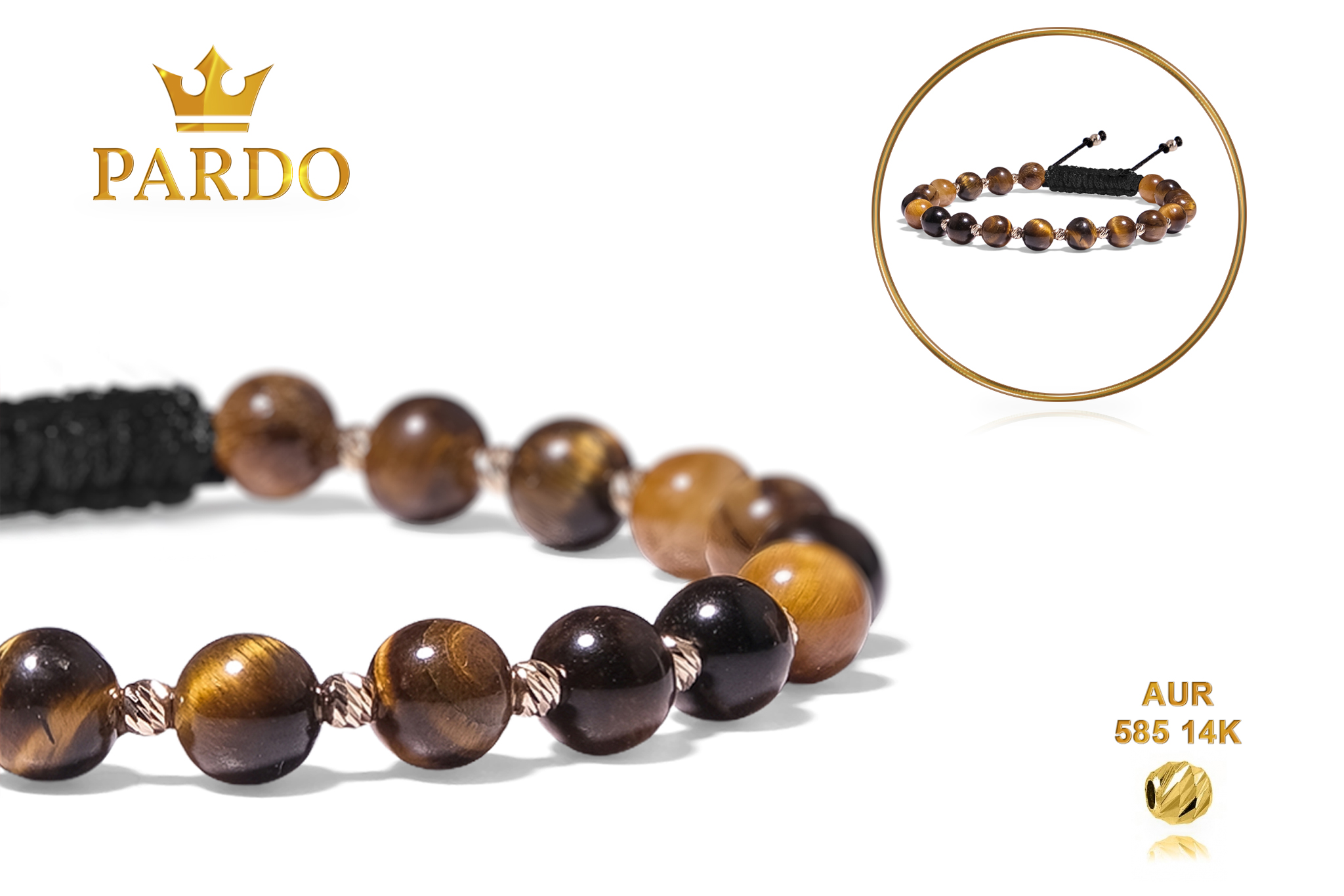 Brățară Pardo realizată cu șnur și bile de Aur 585 14K și Ochi de Tigru Maro