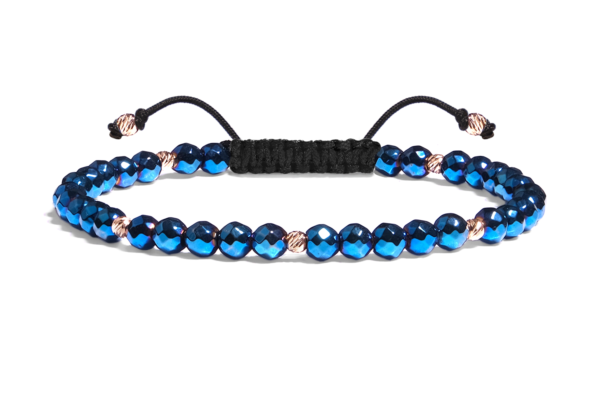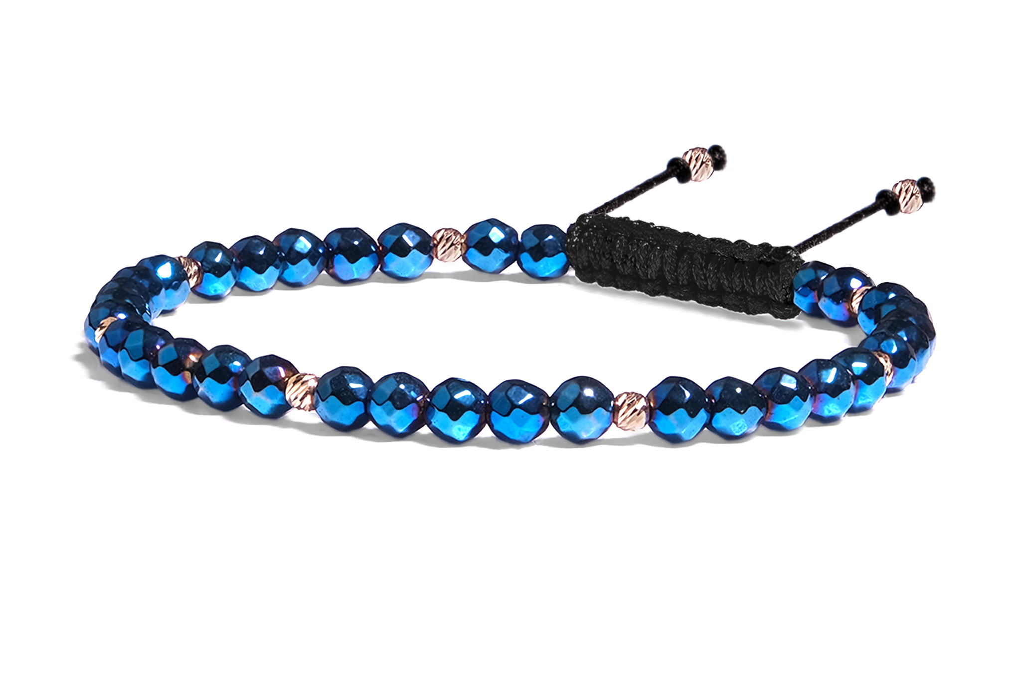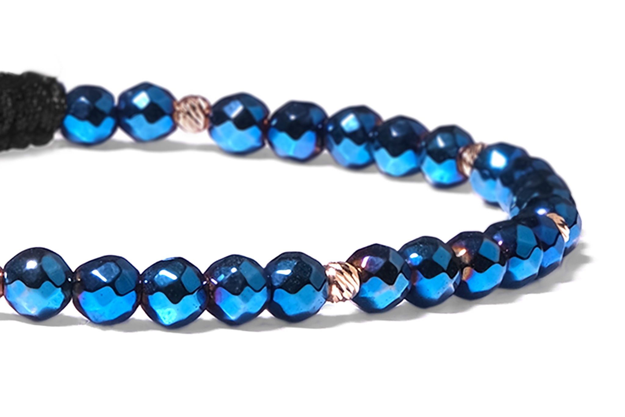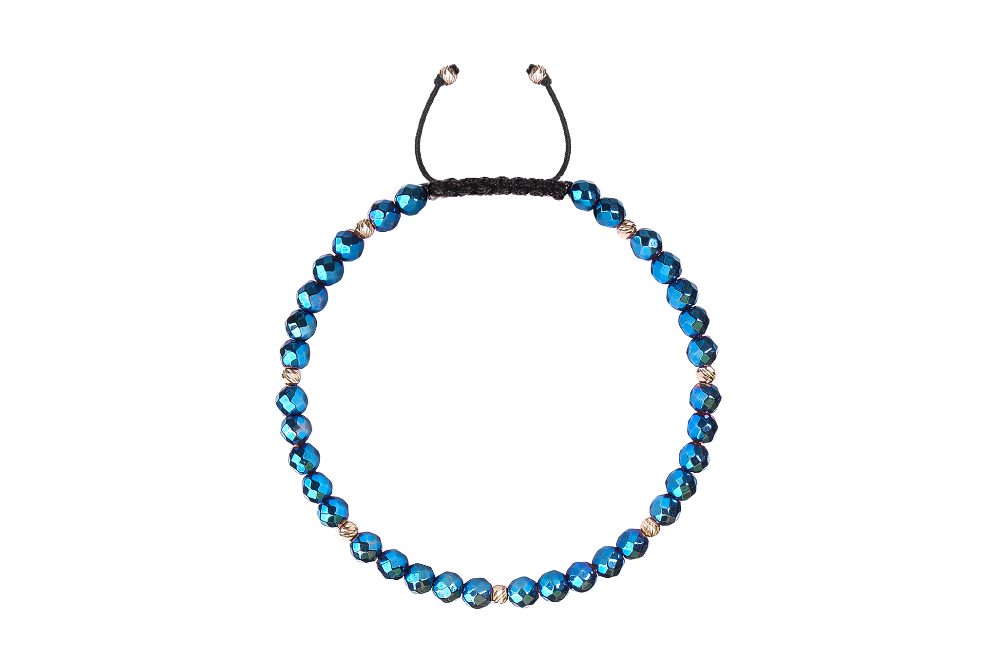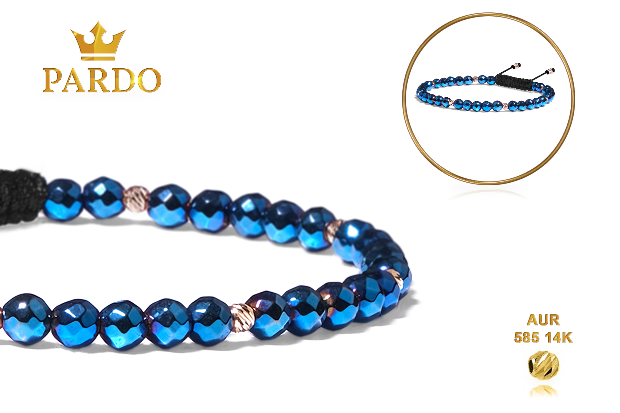 Bratara Pardo realizata cu snur si pietre semipretioase Hematit Albastru Fatetat de 4 mm si sfere striate din Aur 585 de 14 Karate