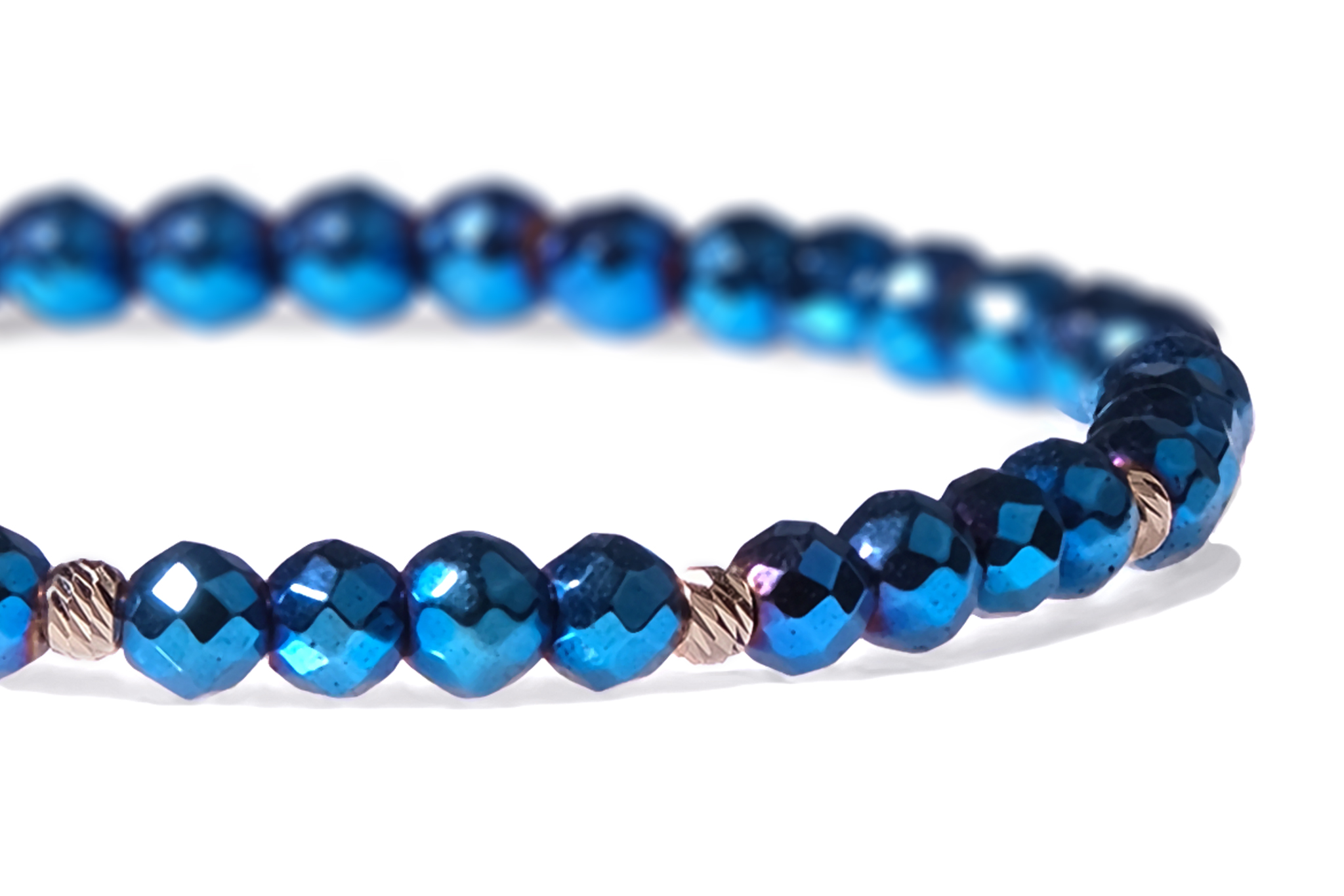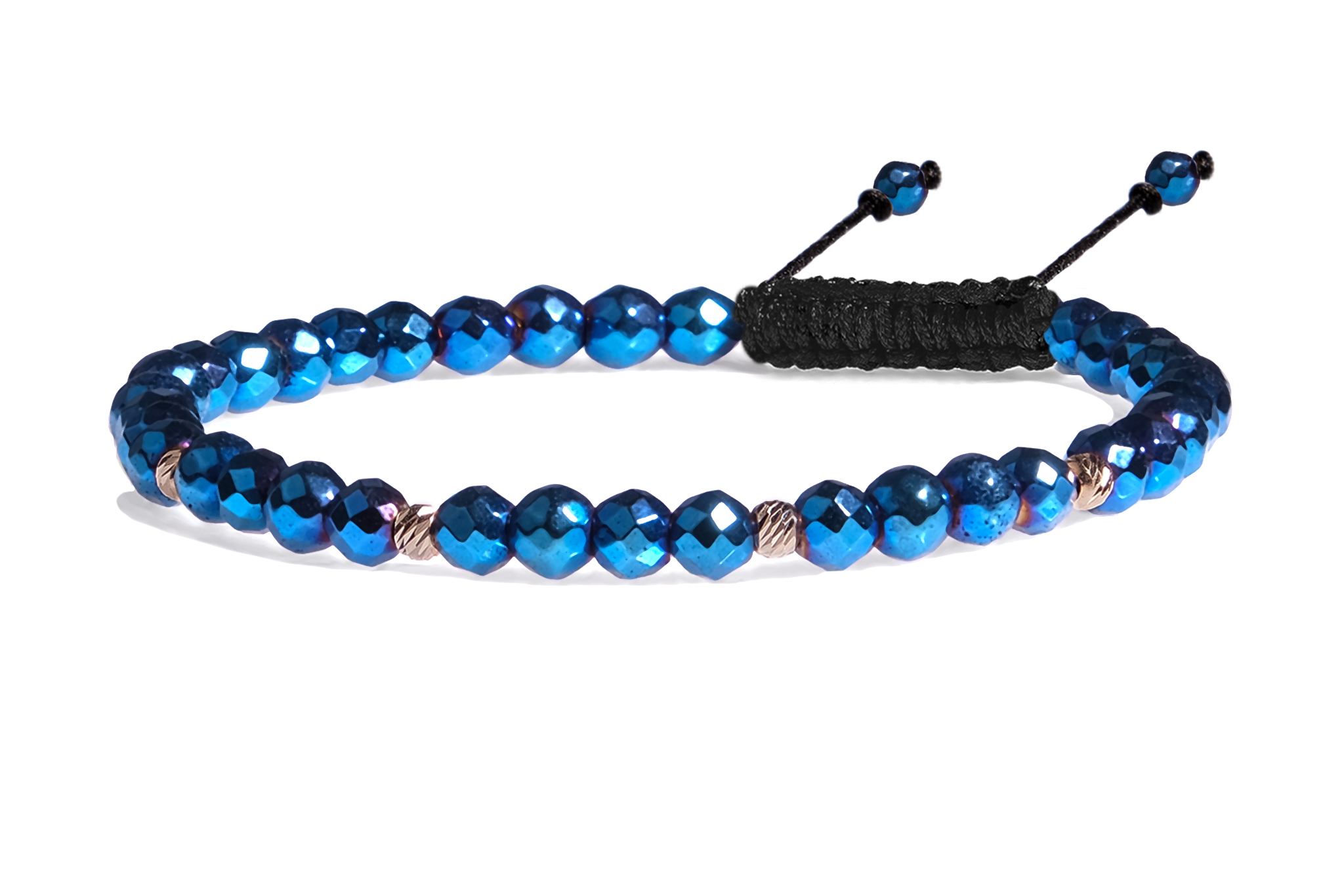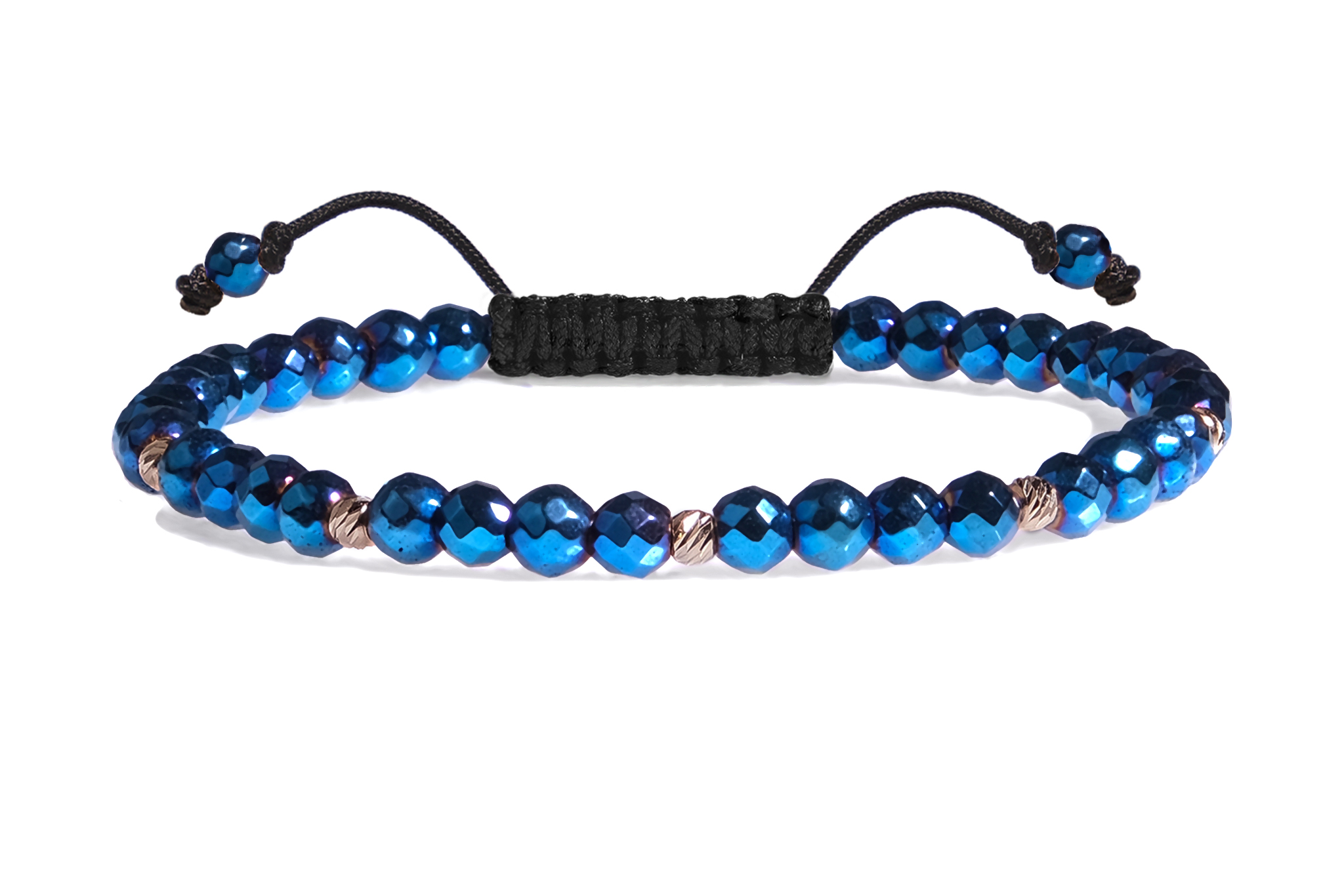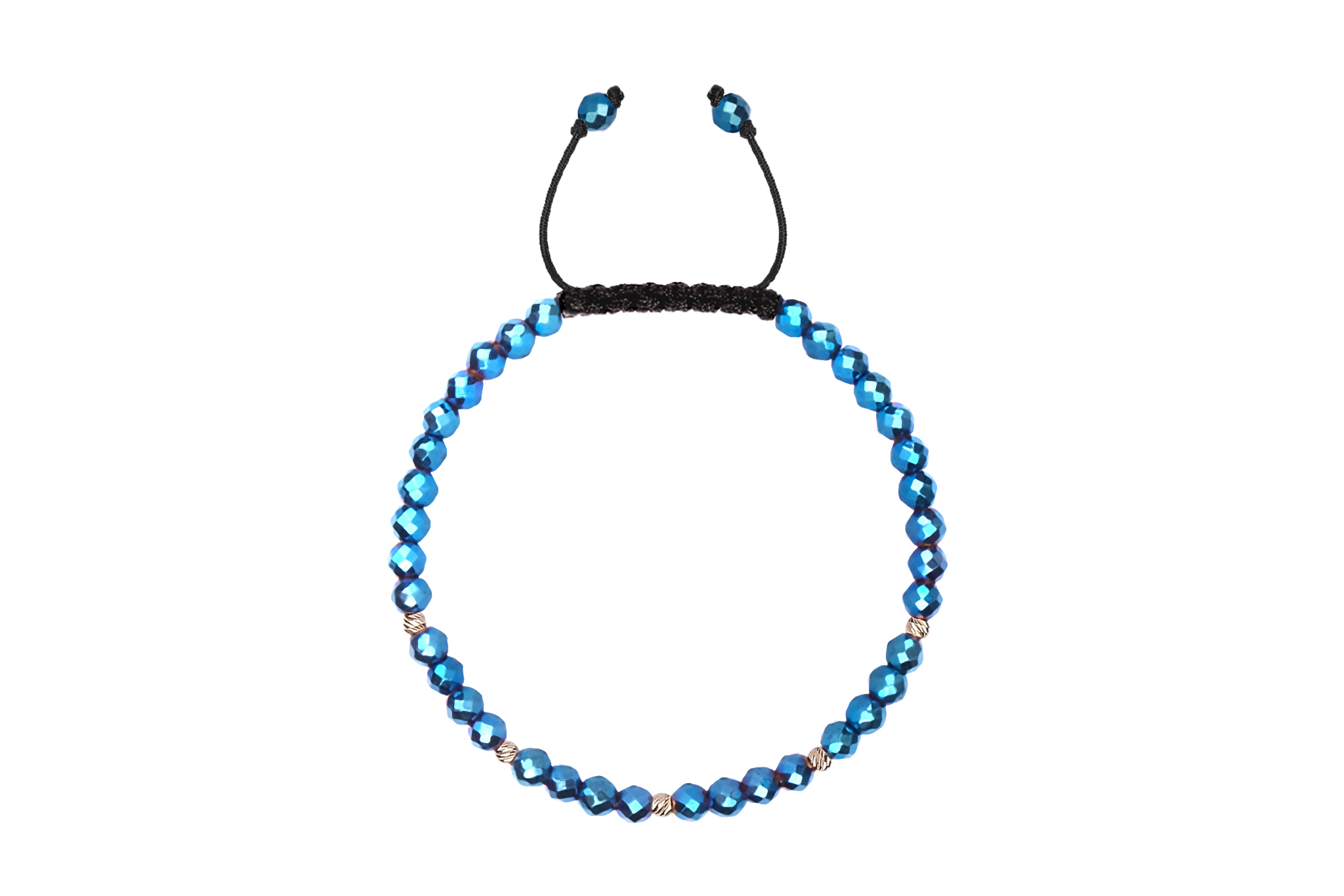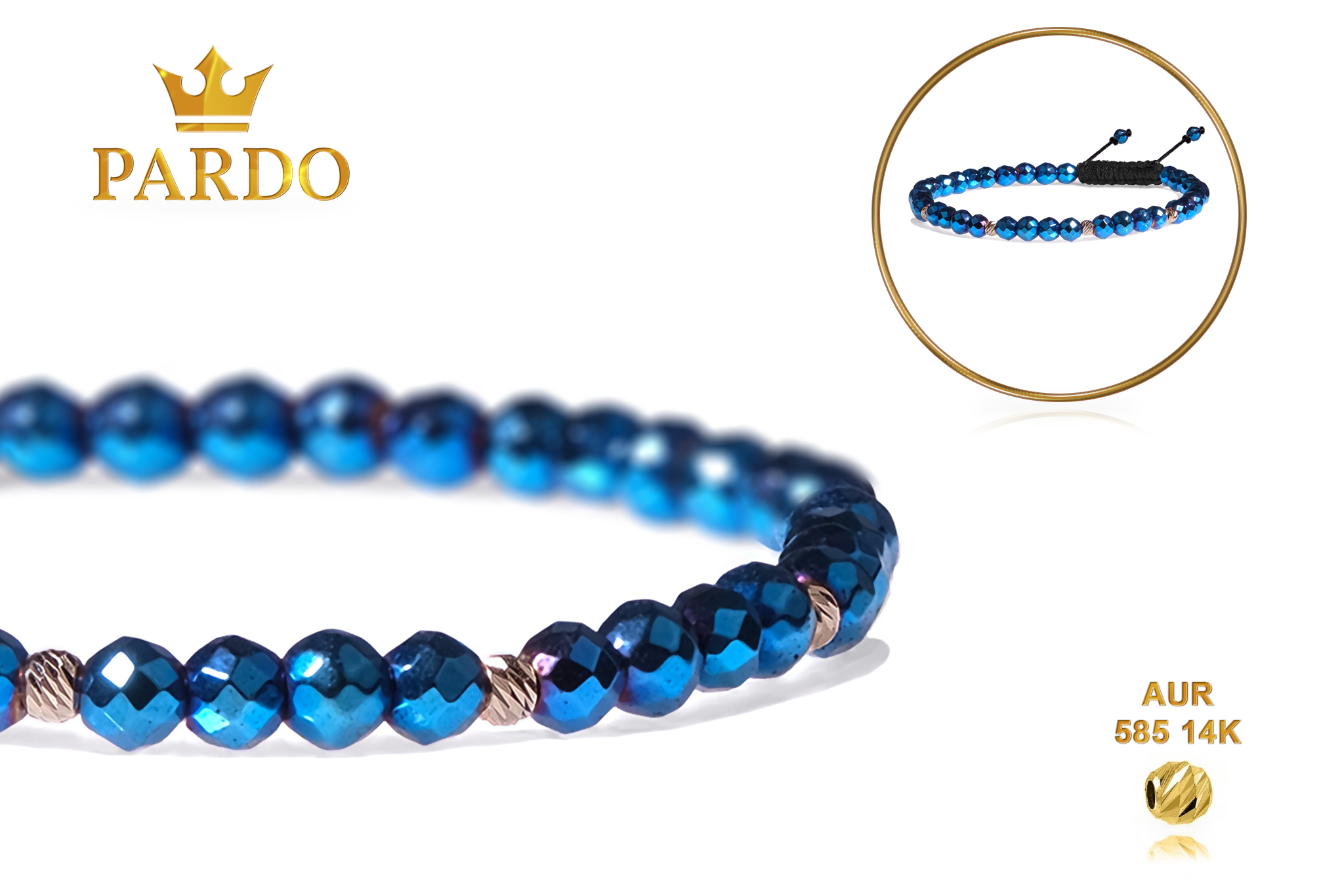 Bratara Pardo realizata cu snur si pietre semipretioase Hematit Albastru Fatetat de 4 mm si sfere striate din Aur 585 de 14 Karate