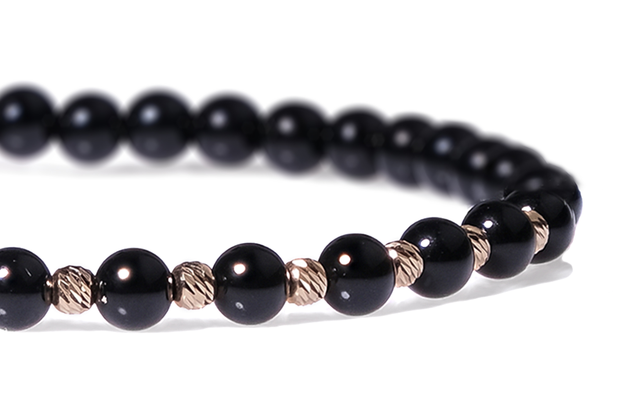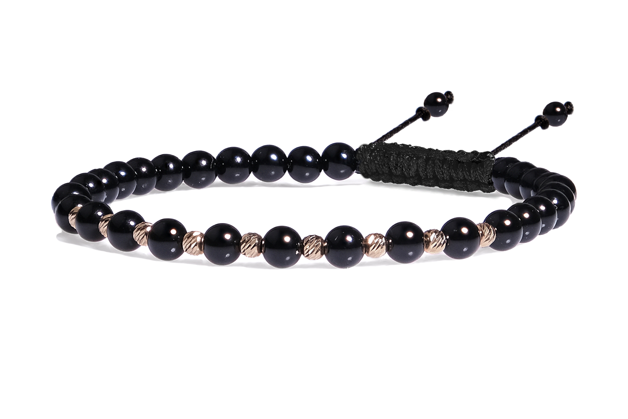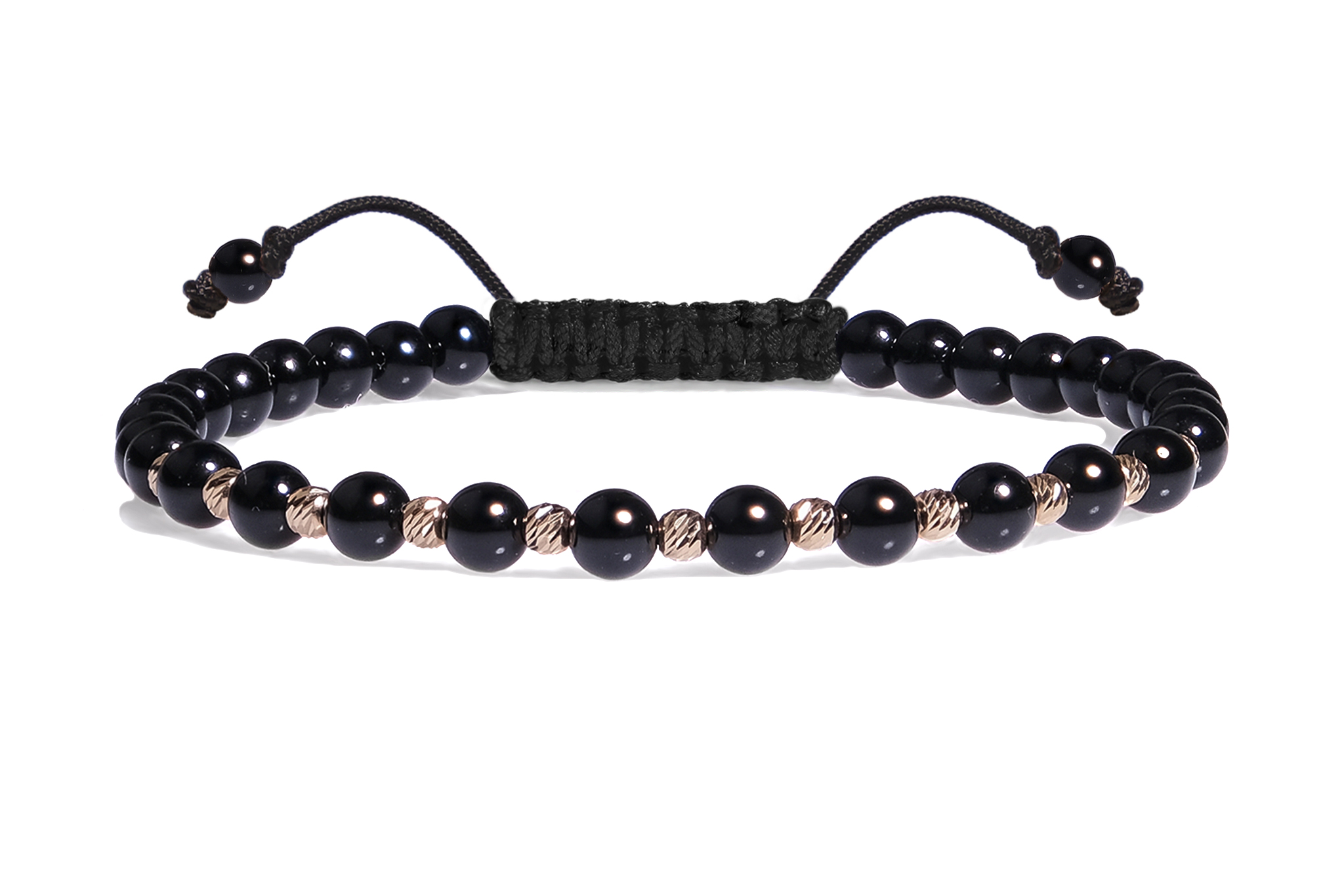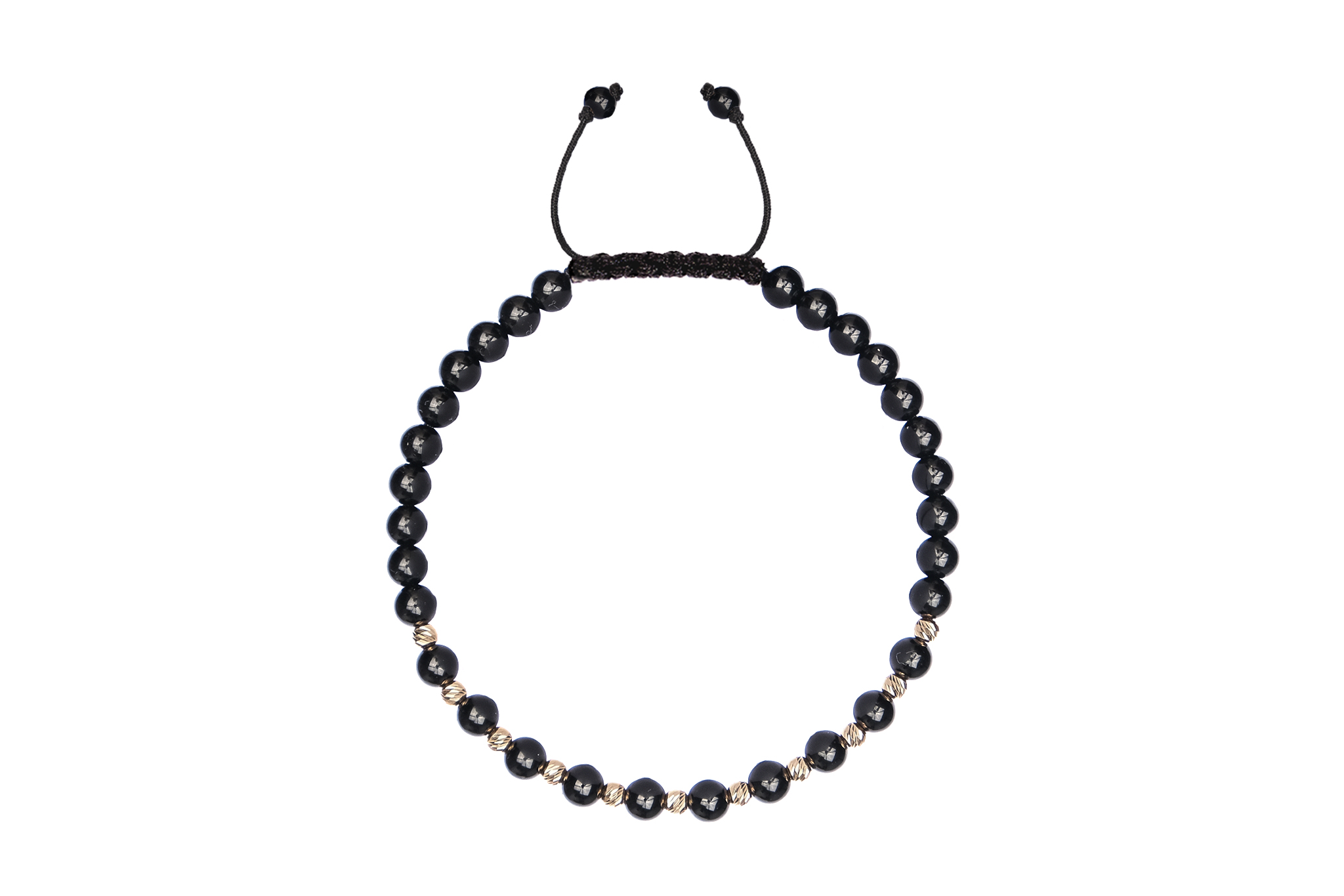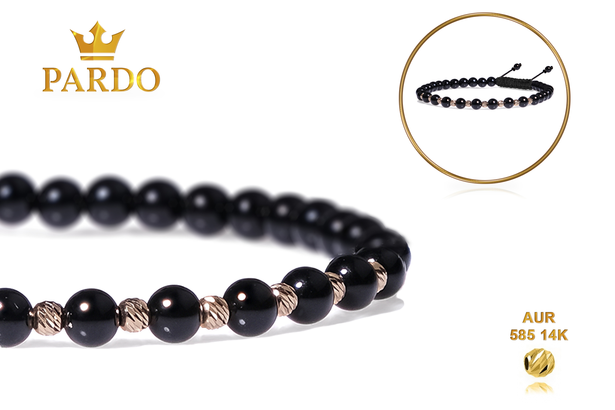 Bratara Pardo realizata cu snur si pietre semipretioase Onix Negru Sfera de 4 mm si sfere striate din Aur 585 de 14 Karate