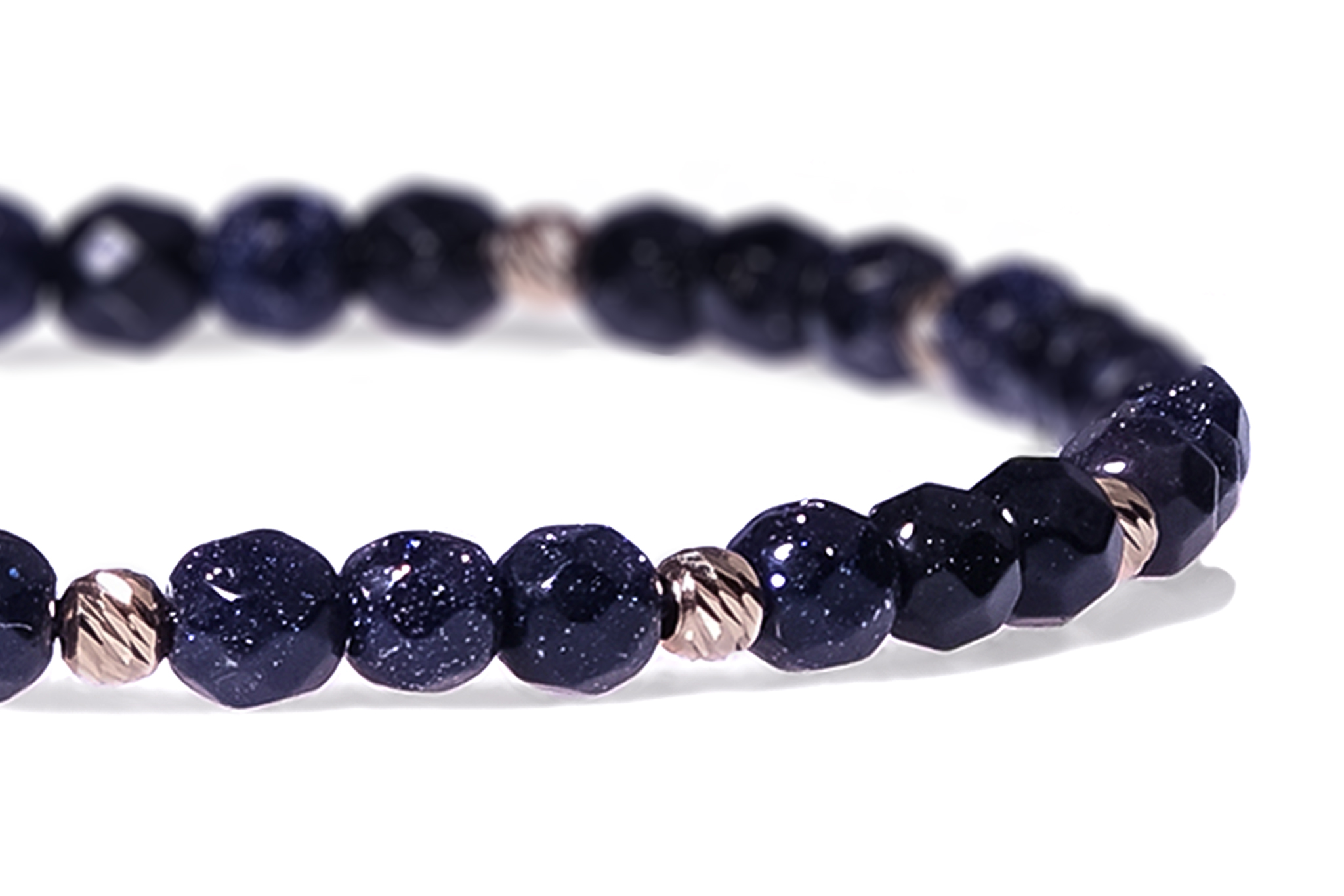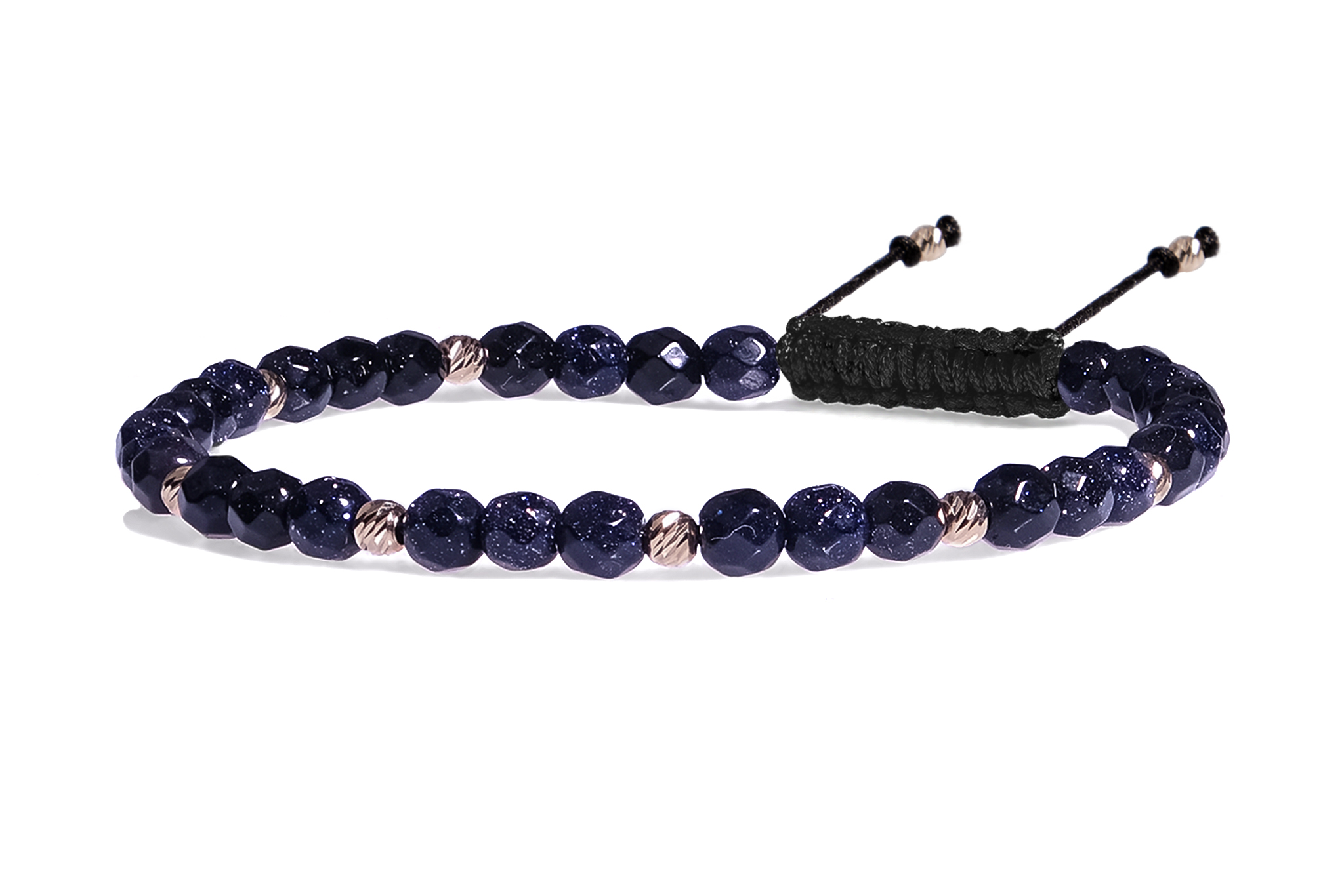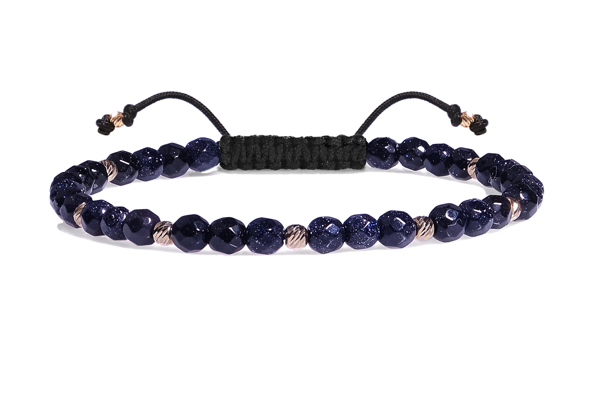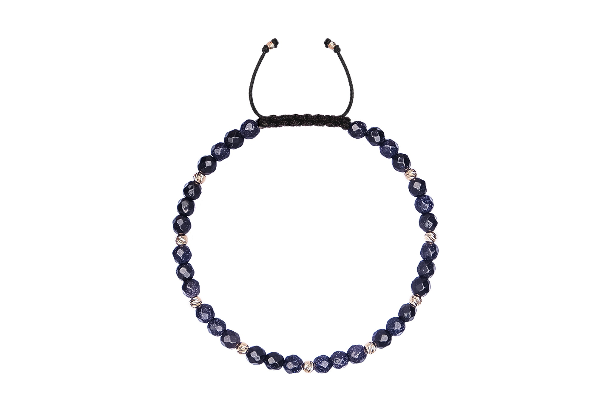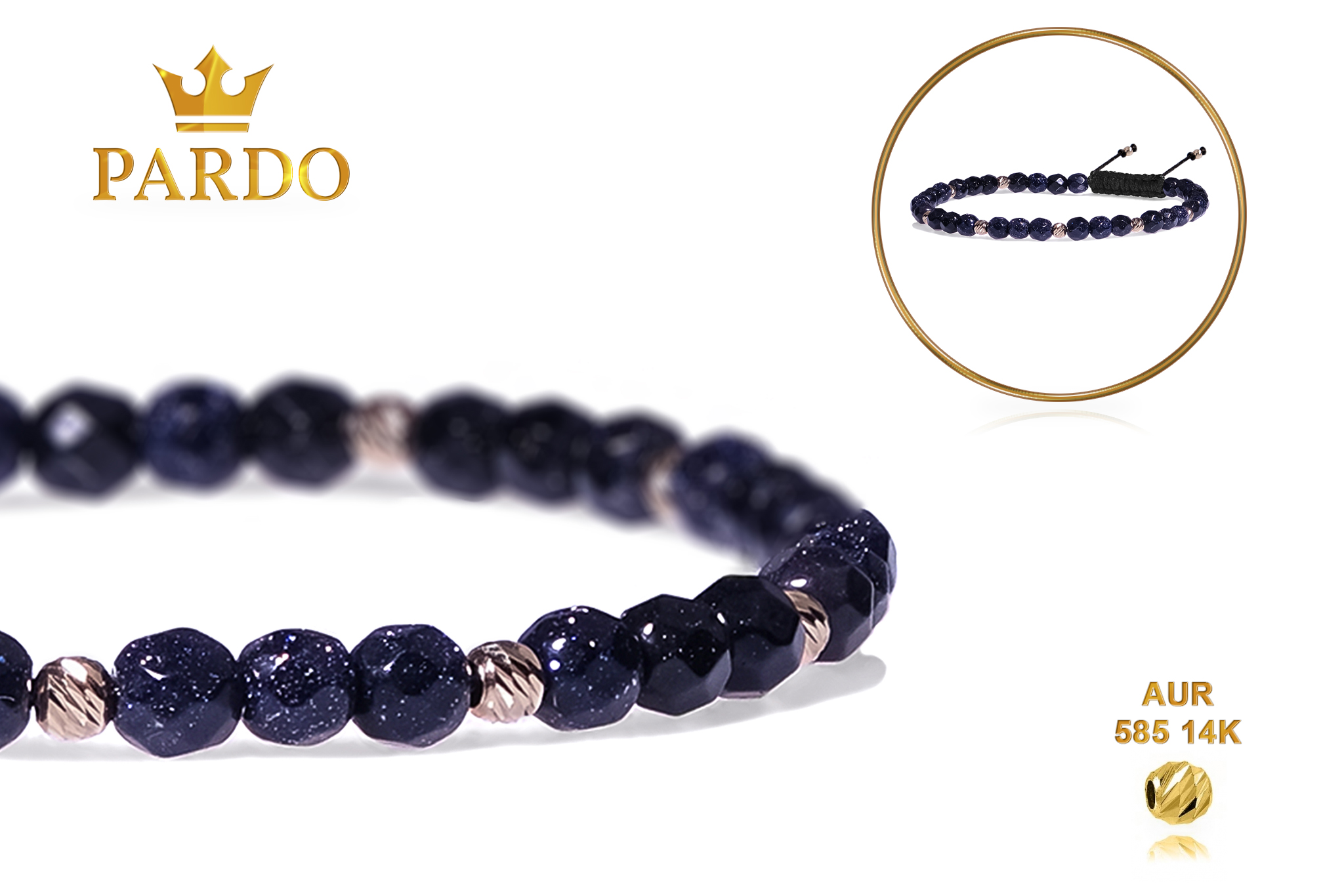 Bratara Pardo realizata cu snur si pietre semipretioase Piatra Soarelui Albastru Fatetata de 4 mm si sfere striate din Aur 585 de 14 Karate