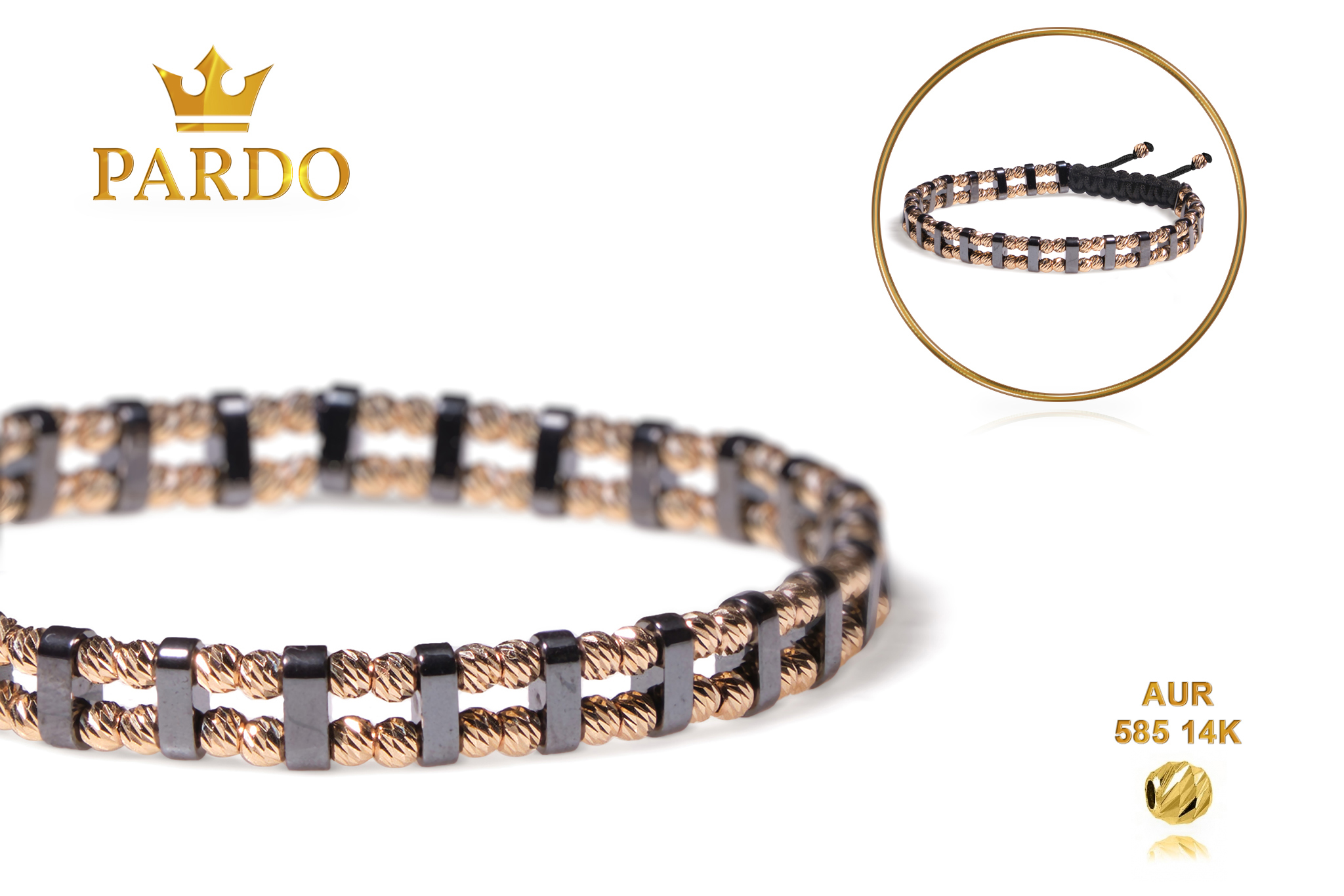 Întreaga colecție de brățări din aur este realizată cu aur de 14 Karate, aur de import Italia, calitatea aurului fiind astfel la un nivel superior. Aurul de 14 Karate folosit pentru colecțiile Pardo Gold este verificat certificat de organele abilitate prin autorizația emisă, astfel acesta corespunde în proportie de 94% din punct de vedere al caratajului cât și al gramajului.