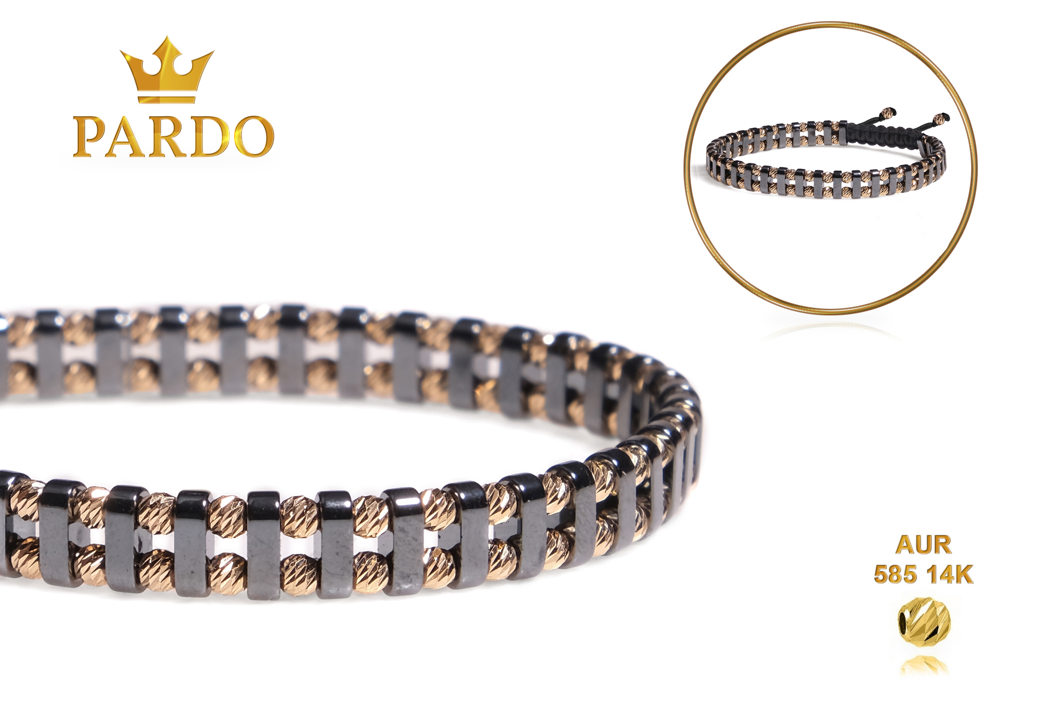 Întreaga colecție de brățări din aur este realizată cu aur de 14 Karate, aur de import Italia, calitatea aurului fiind astfel la un nivel superior. Aurul de 14 Karate folosit pentru colecțiile Pardo Gold este verificat certificat de organele abilitate prin autorizația emisă, astfel acesta corespunde în proportie de 94% din punct de vedere al caratajului cât și al gramajului.